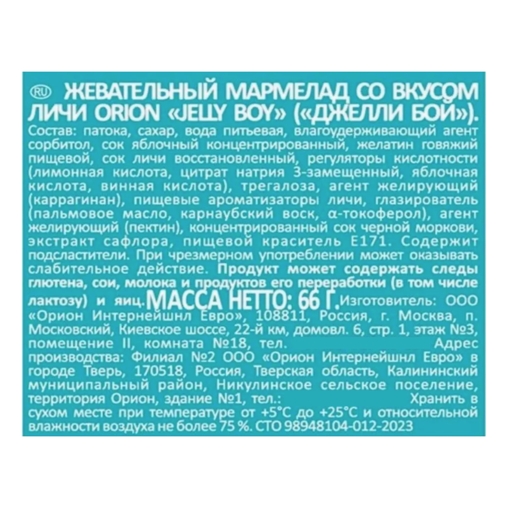 | Состав | патока, сахар, влагоудерживающий агент сорбитол, вода питьевая, сок яблочный концентрированный, желатин говяжий пищевой, сок личи восстановленный, трегалоза, регуляторы кислотности (лимонная кислота, цитрат натрия 3-замещенный, яблочная кислота, винная кислота), агент желирующий (каррагинан), пищевые ароматизаторы личи, агент желирующий (пектин), глазирователь (пальмовое масло, карнаубский воск, ?-токоферол), концентрированный сок черной моркови, экстракт сафлора, пищевой краситель е171 |