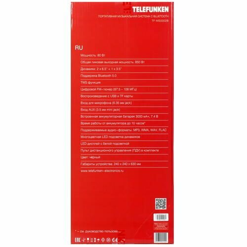 Музыкальная система TF-MS3302B от бренда Telefunken обладает им из самых высоких показателей пиковой музыкальной мощности в 850 Вт. Благодаря 2-м основным динамикам по 6,5 каждый и одному встроенному высокочастотному динамику система воспроизводит частоты от 80 до 20 000 Hz.
