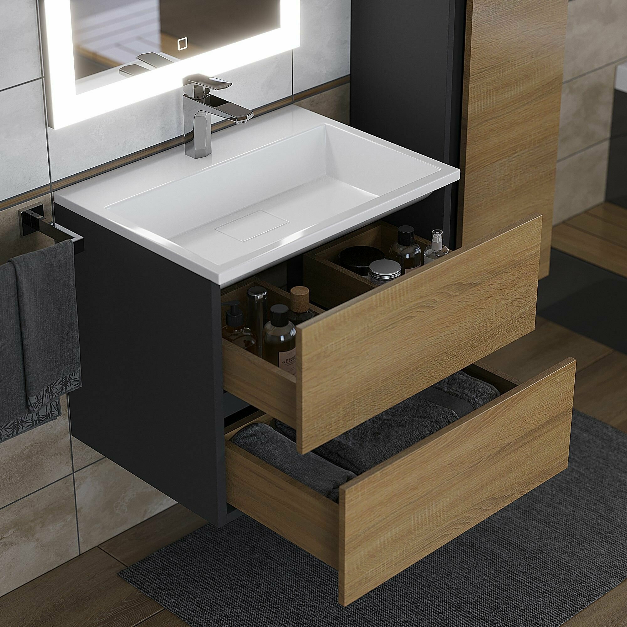 Подвесная тумба под раковину для ванной Uperwood Barsa с двумя выдвижными ящиками представляет собой функциональное, надежное и практичное решение, которое отлично впишется в любой современный дизайн ванной комнаты.Подвесной монтаж изделия обеспечит легкость в уборке помещения, и визуально даст больше пространства Вашей ванной комнате.Фасад и боковые стенки изделия, выполненные из МДФ, покрыты эмалью Hesse (производство Германия). Толщина МДФ 16 мм.Фасад - ЛДСП в пленке под дерево, цвет дуб сонома. Выдвижные ящики изготовлены из влагостойкой ЛДСП. Ящики оснащены доводчиками. Вся фурнитура и доводчики премиум класса.Размерный ряд тумб под раковину для ванной Uperwood Barsa представлен моделями 60, 70, 80 и 100 см.Для тумб Uperwood Barsa подходят раковины Uperwood Barsa соответствующих размеров черного или белого цвета.Тумба поставляется в собранном виде, в комплект входит крепеж для подвесного монтажа. Дополните Ваш комплект из тумбы и раковины Uperwood Barsa подвесным шкафом-пеналом из коллекции Barsa белого (арт. 293020529) или черного цвета (арт. 293020545) . Также можно собрать полноценный комплект, добавив зеркало с led-подсветкой из коллекции Uperwood Barsa.