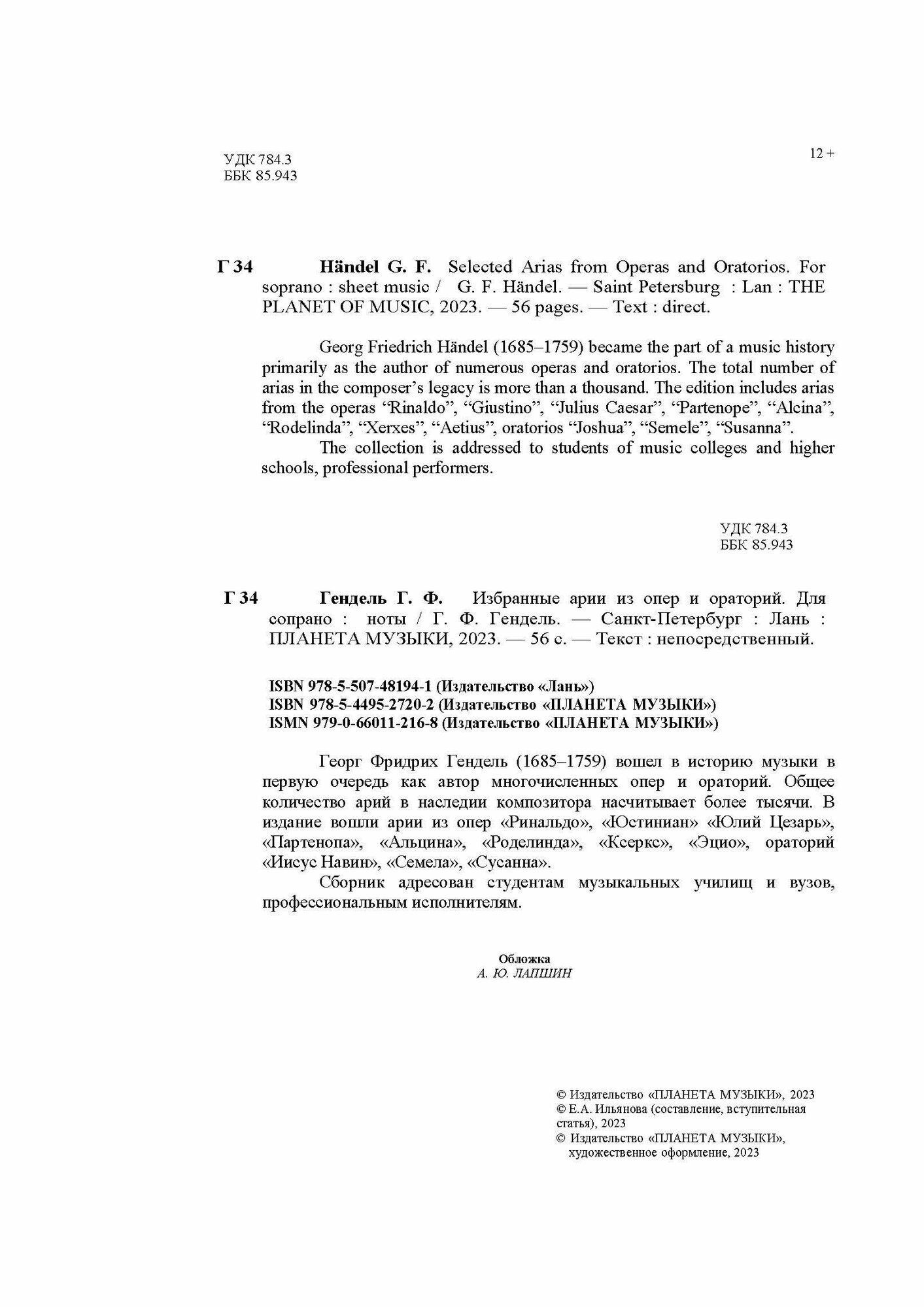 Избранные арии из опер и ораторий. Для сопрано. Ноты (Георг Фридрих Гендель); Издательство «Планета музыки», 2023