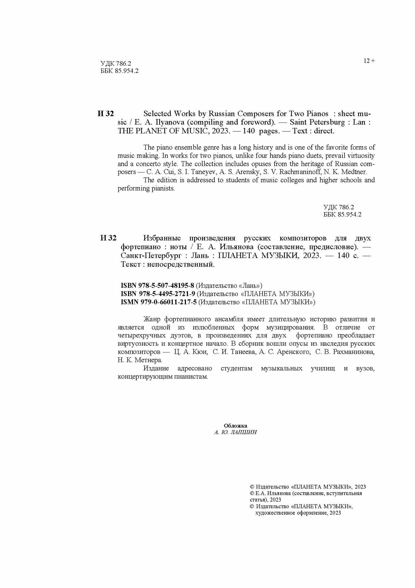 На сегодняшний день товар «Книга: Избранные произведения русских композиторов для 2 фортепиано. Ноты (Группа авторов); Издательство «Планета музыки», 2023» можно купить с кешбеком в 1 магазине: ЛитРес