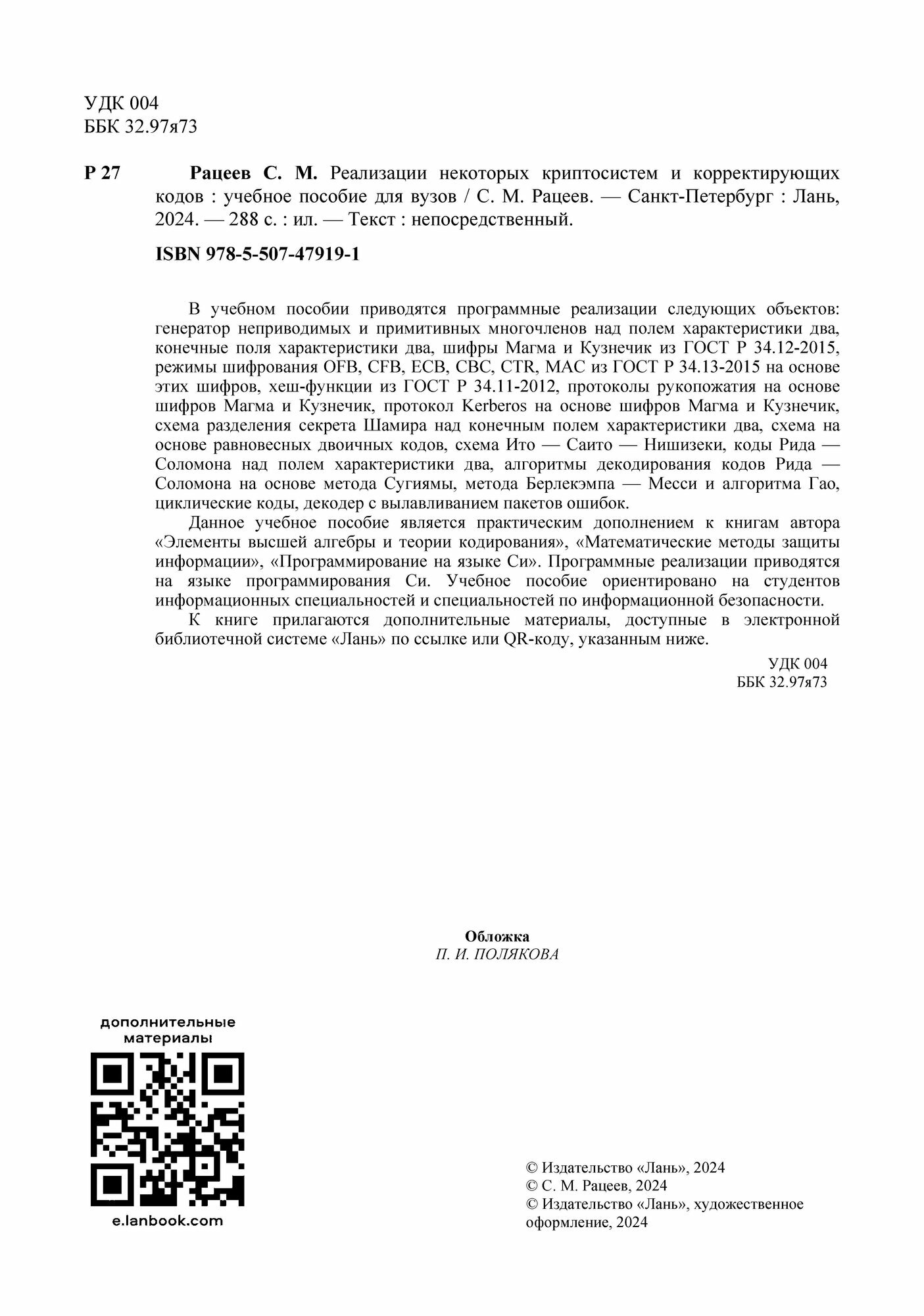 Реализации некоторых криптосистем и корректирующих кодов. Учебное пособие (Рацеев Сергей Михайлович); Лань, 2024