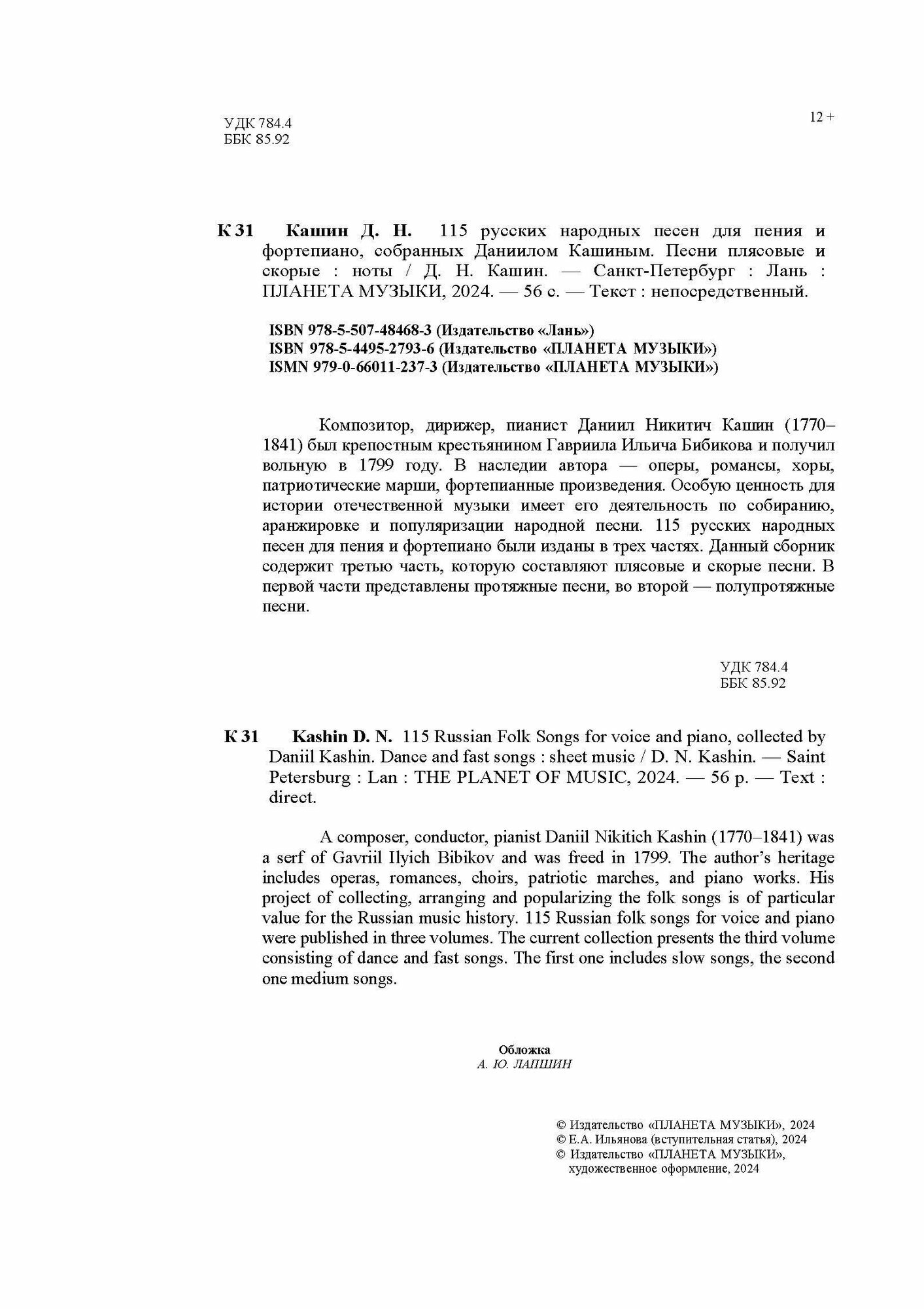 115 русских народных песен для пения и фортепиано собранных Даниилом Кашиным. Песни плясовые. Ноты (Кашин Даниил Никитич); Планета Музыки, 2024