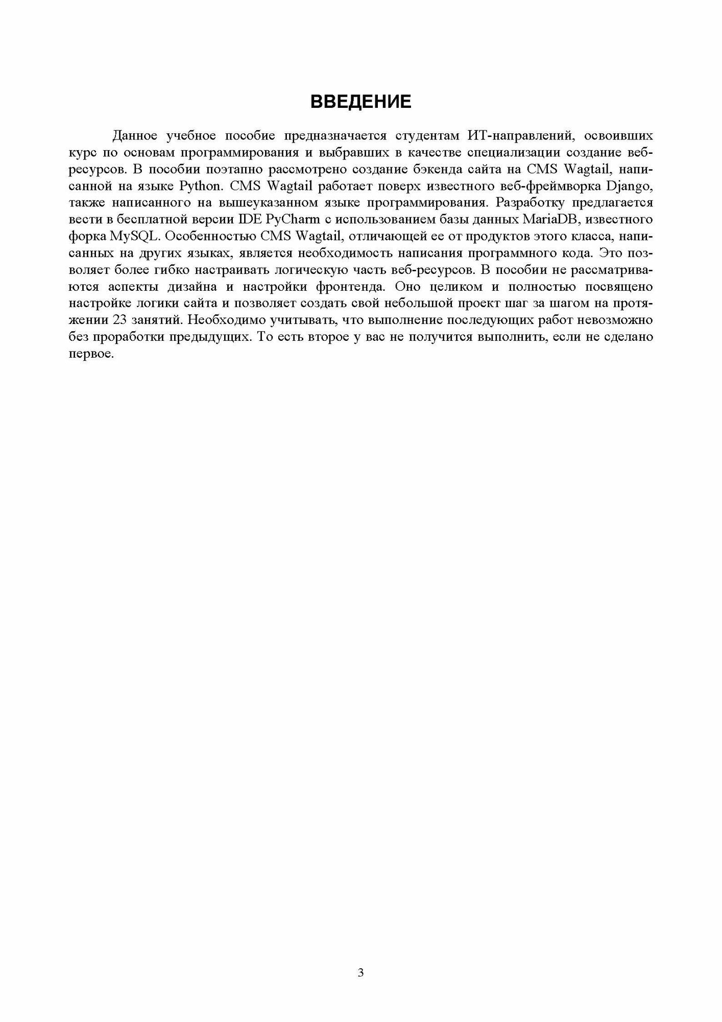 В учебном пособии рассматривается поэтапное, на протяжении 23 занятий, создание бэкенда сайта на основе бесплатной системы управления контентом - CMS Wagtail версии IDE PyCharm c использованием базы данных MariaDB, известного форка MySQL. Особенностью CMS Wagtail является необходимость написания программного кода. Это позволяет более гибко настраивать логическую часть веб-ресурсов. В пособии не рассматриваются аспекты дизайна и настройки фронтенда.