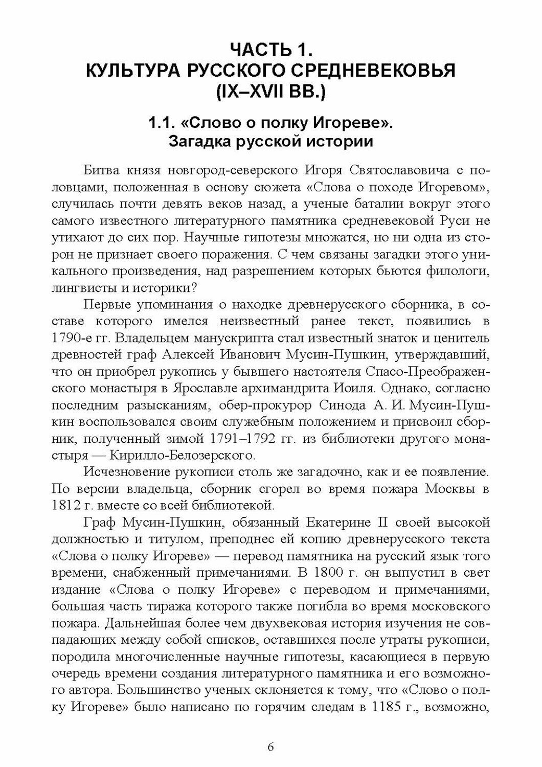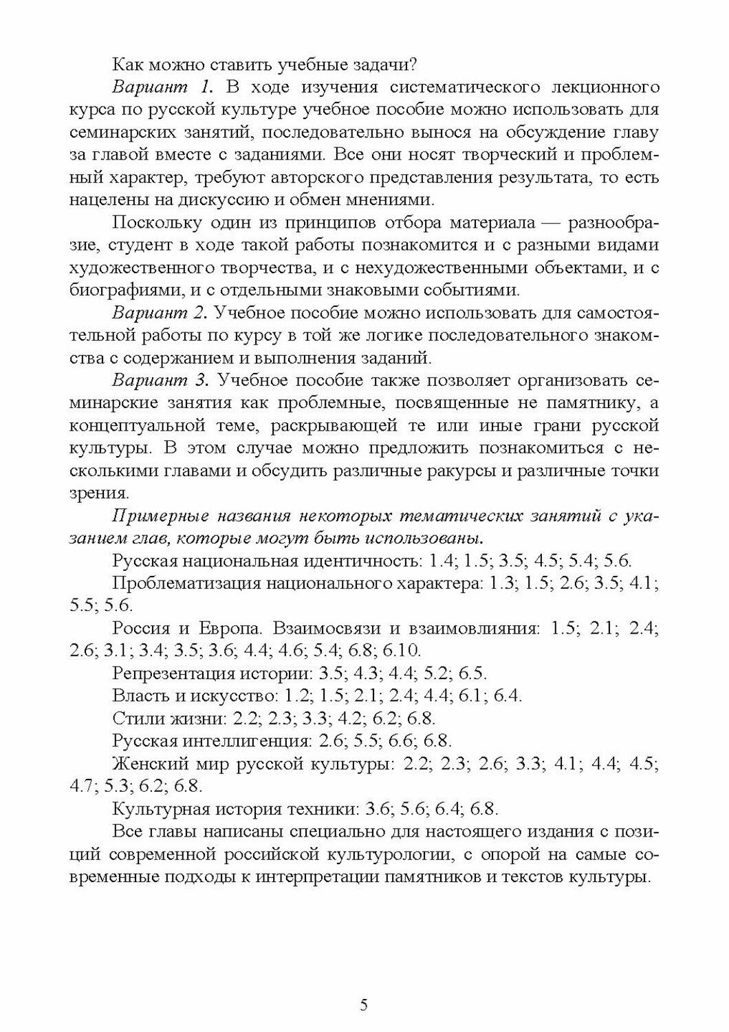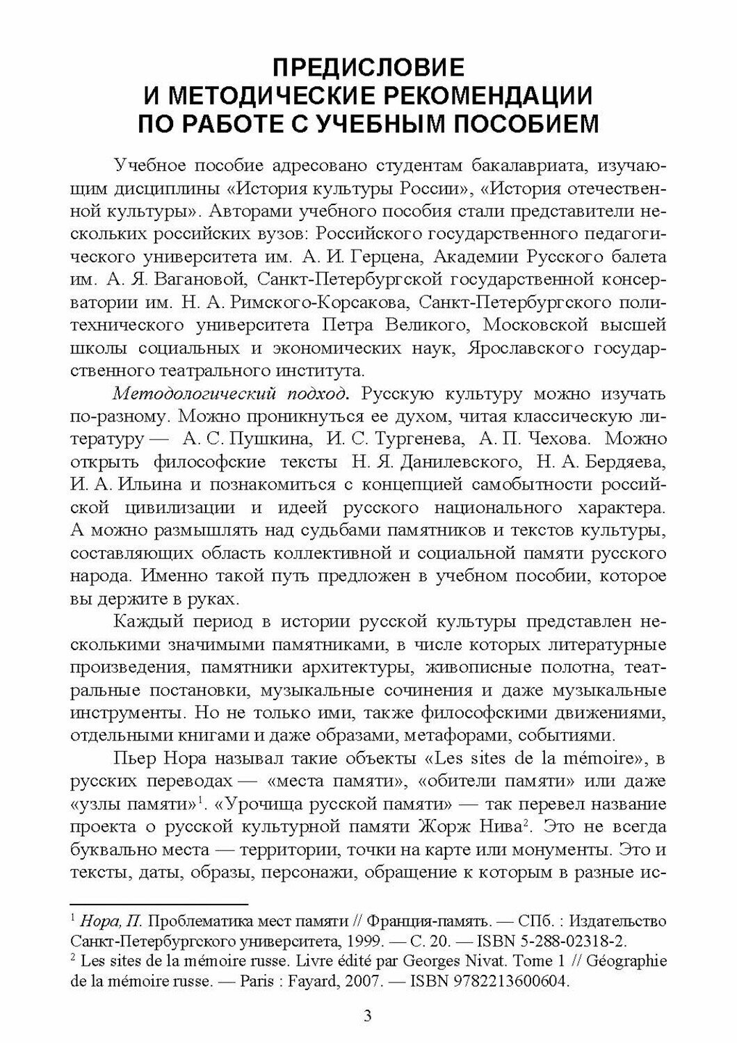 Учебное пособие знакомит студентов с важнейшими явлениями культуры России, которые входят в комплекс нашей культурной памяти. Особенность его состоит в том, что историко-культурная проблематика каждой исторической эпохи дается через анализ ключевых памятников, в числе которых: литературные произведения, творения архитектуры, живописные полона, театральные постановки, а также идейные движения, художественные образы и метафоры. Концептуально авторы опирались на идею "культурной памяти", показывающую, каким образом памятники, тексты и метафоры воспринимаются гражданами России как выражение самых сокровенных смыслов и ценностей их национальной и цивилизационной идентичности. Остается добавить, что материал расположен в хронологическом порядке, в предисловии даны методические указания, а каждый параграф сопровождается проверочными заданиями.