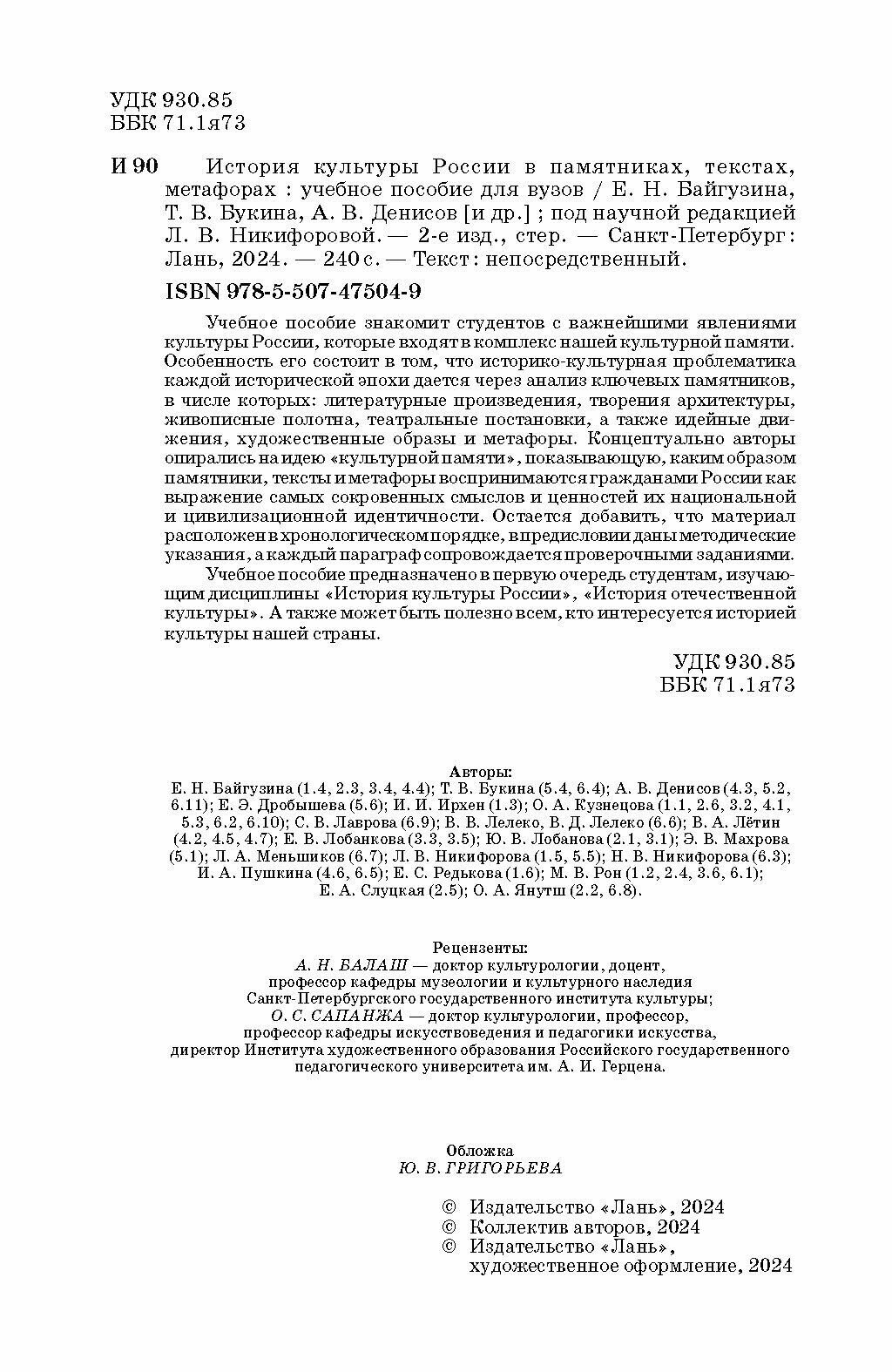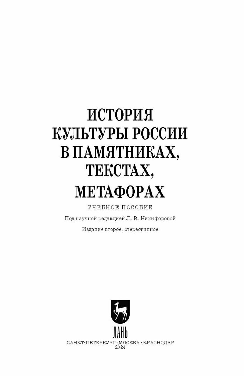 История культуры России в памятниках текстах метафорах. Учебное пособие (Байгузина Елена Николаевна, Денисов Андрей Владимирович, Букина Татьяна Вадимовна); Лань, 2024