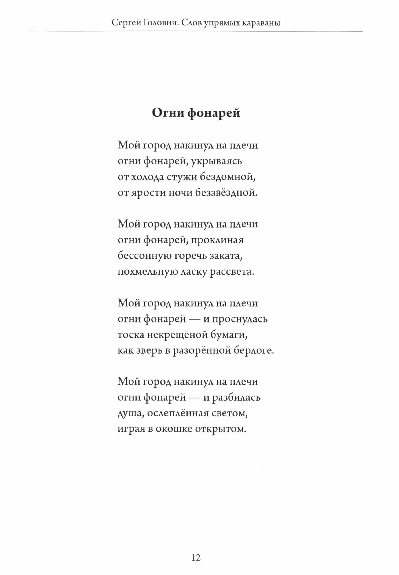 В сборник «Слов упрямых караваны» вошли стихи, написанные в период 2010–2023 гг. Основные темы книги: мистика детских воспоминаний, взаимоотношения человека и города, ценность встреч и расставаний, мироощущение во время глобальных трагедий, вера в торжество гуманности, уникальность и величие каждого момента в цикличности бытия.
