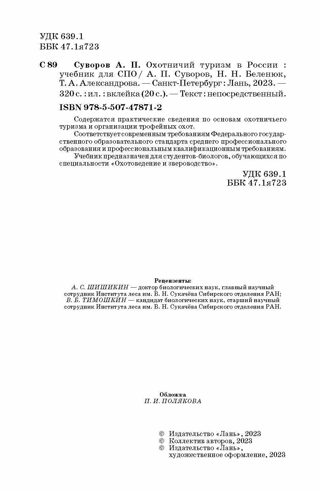 Охотничий туризм в России. Учебник (Суворов Анатолий Прохорович, Беленюк Надежда Николаевна, Александрова Татьяна Анатольевна); Лань, 2023