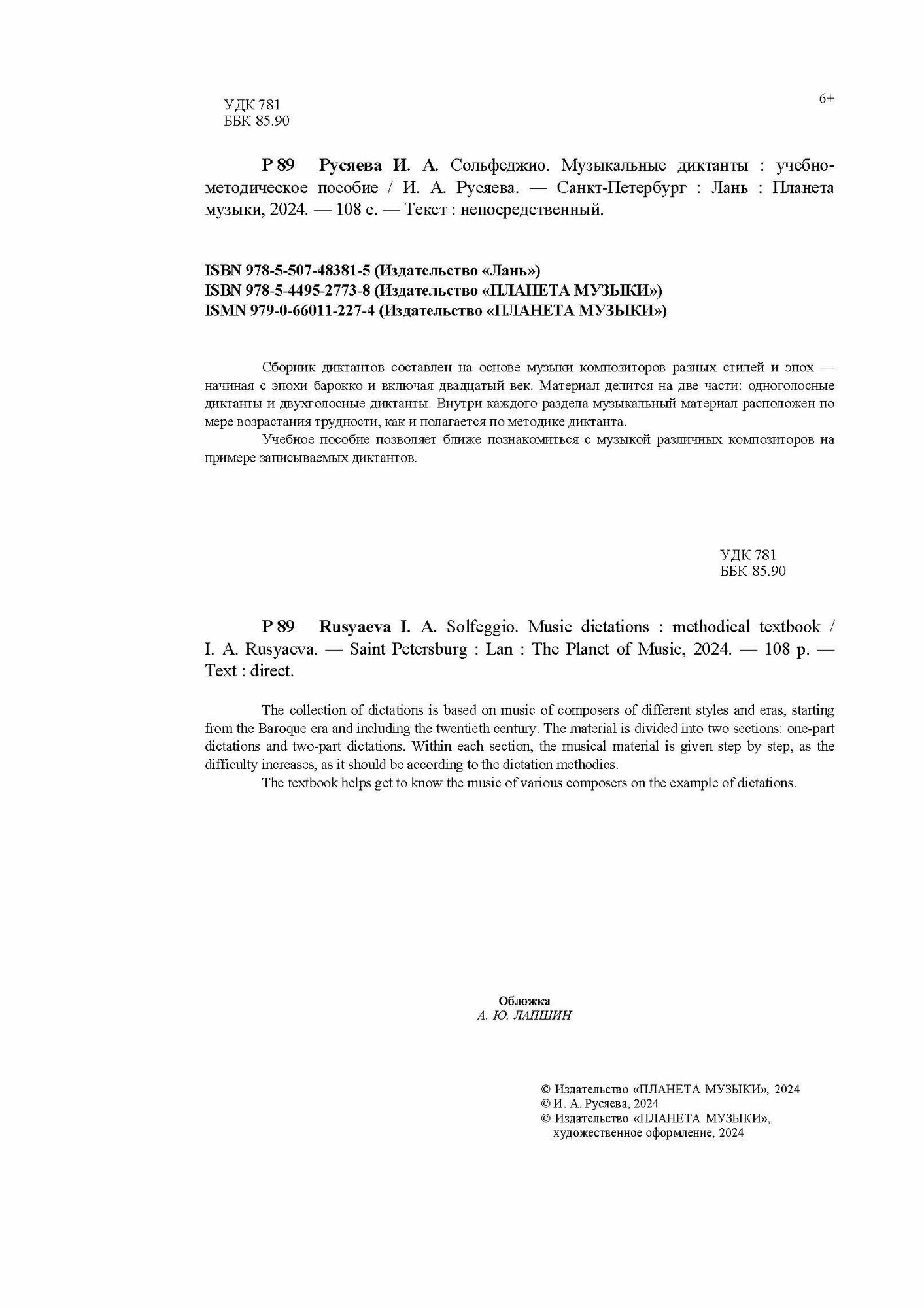 Сольфеджио. Музыкальные диктанты. Учебно-методическое пособие (Русяева Ирина Анатольевна); Планета Музыки, 2024