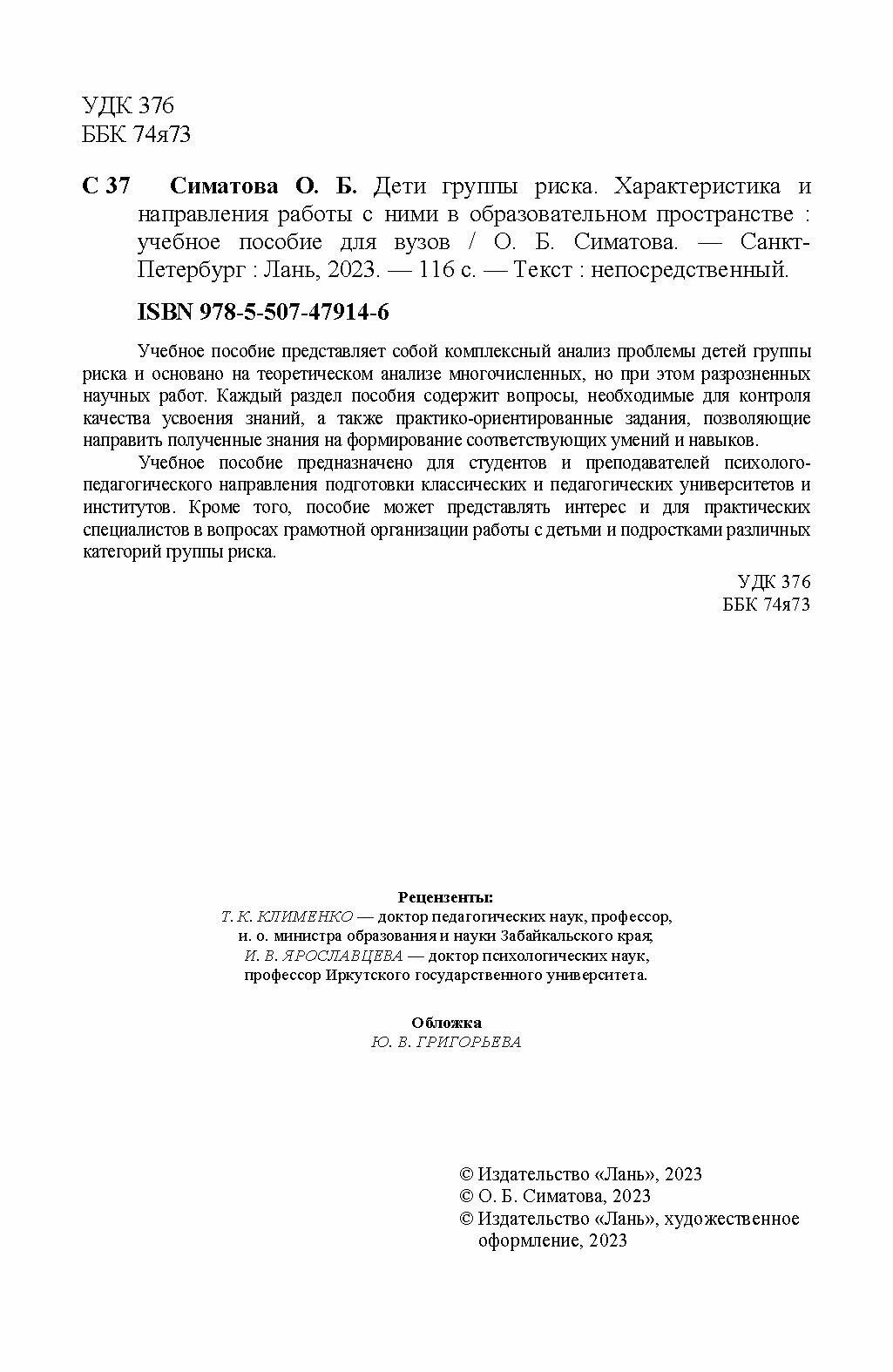 Дети группы риска. Характеристика и направления работы с ними в образовательном пространстве (Симатова Оксана Борисовна); Лань, 2023
