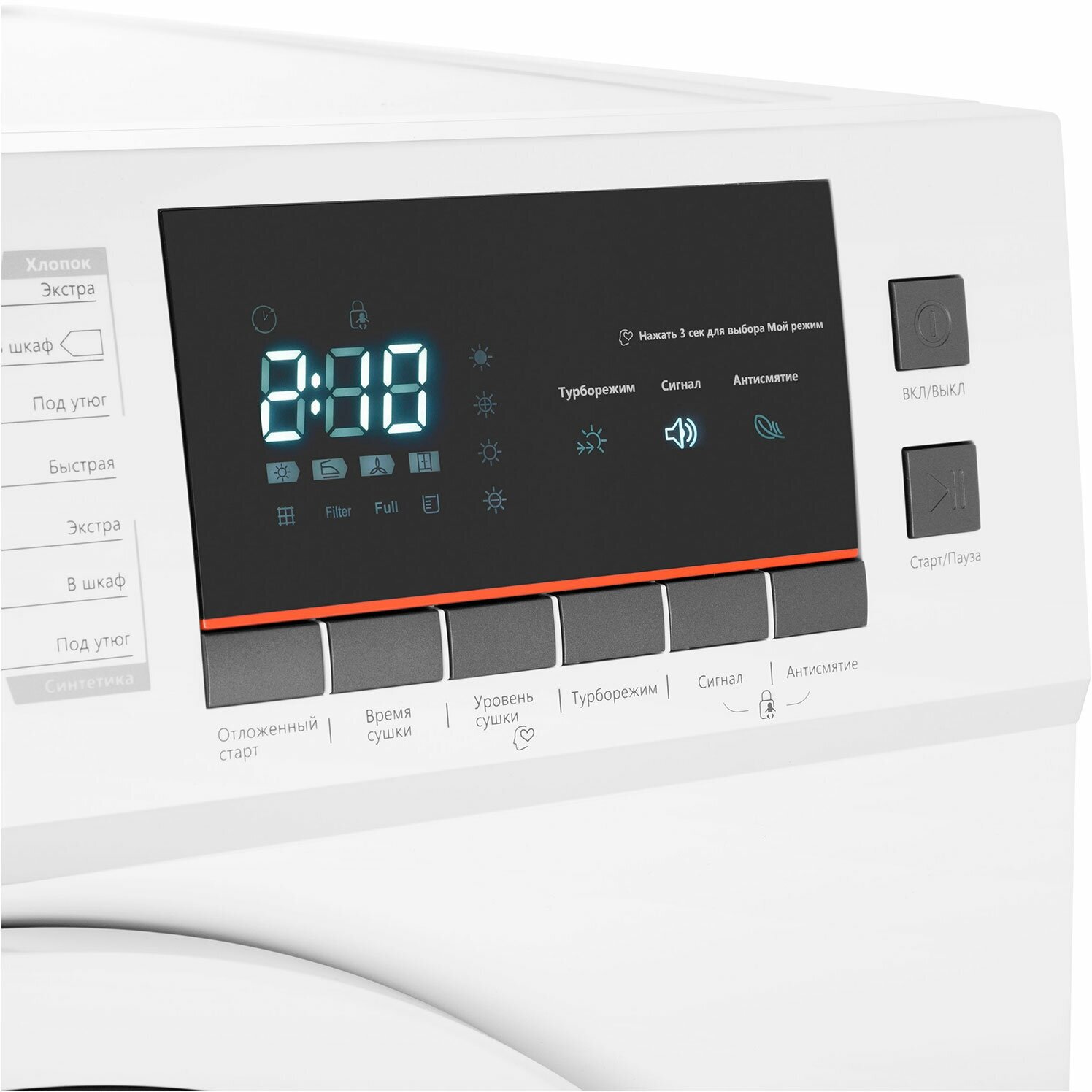 Отдельностоящая сушильная машина с загрузкой белья до 8 кг. Электронное управление. Датчик влажности. Высококачественная сталь барабана устойчива к механическим воздействиям. Ребра-активаторы предотвратят скручивания и смятие тканей. Блокировка от детей. Программа "Мой режим" - запоминает параметры, ползволит запустить машину только одним нажатием. Внутренняя подсветка. Функция "Отложенный старт", режимы "Антисмятие", "турборежим" и др (всего 16 режимов сушки). Низкий уровень шума 69 дБ.