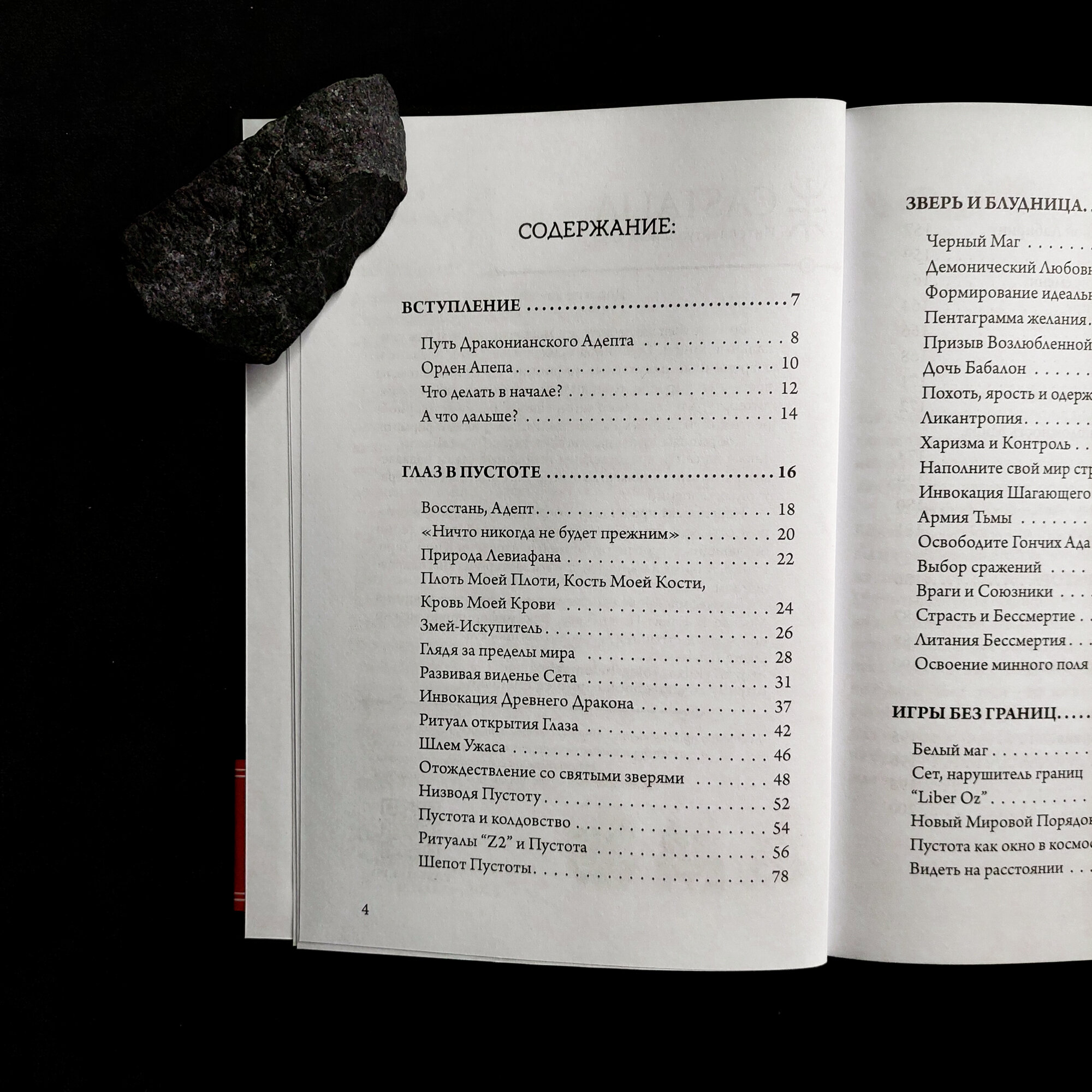 Она намеренно полна противоречий и разночтений, характерных для Бездны, где время и пространство больше не существуют. И в отличие от большинства оккультных книг, которые не дают никаких результатов, здесь есть РЕАЛЬНАЯ сила — используйте её на свой страх и риск. Пришло время Древнему Дракону Апепу проглотить наконец Солнце. Позвольте сознанию Дракона проникнуть в ваш разум. Вы уже никогда не будете прежними. Ничто не будет прежним.