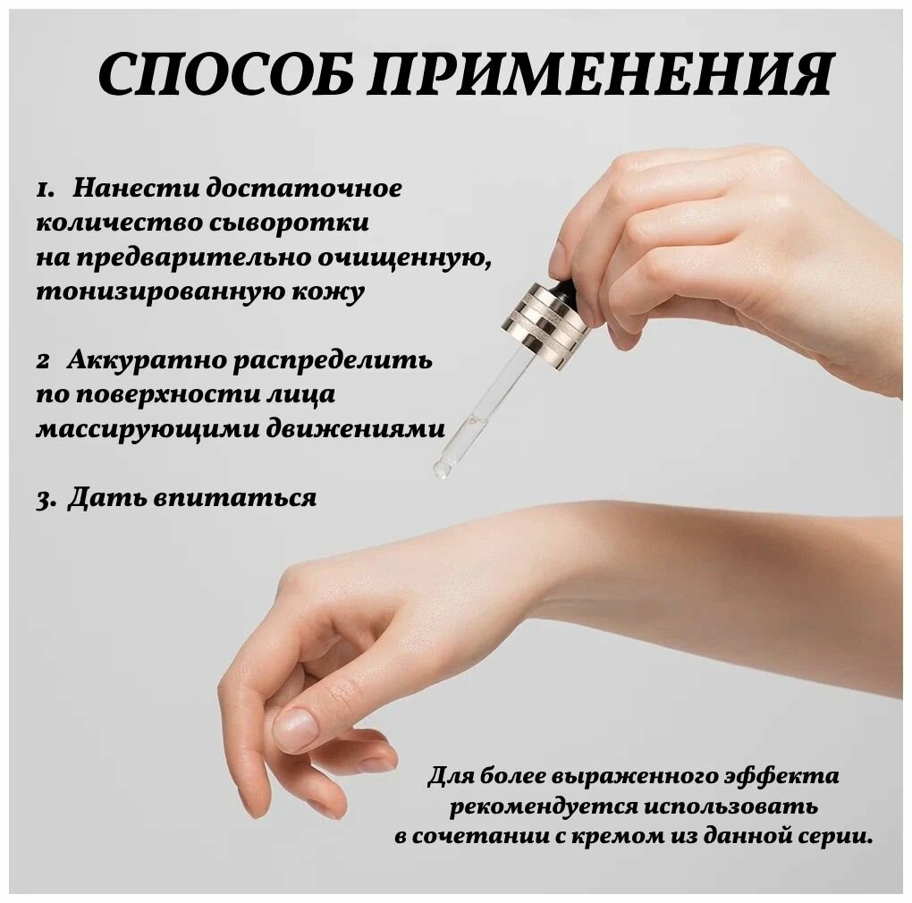 | Способ применения | нанесите ампульную сыворотку на подушечки пальцев и лёгкими похлопывающими движениями распределите средство на кожу лица, шеи и зоны декольте до этапа нанесения крема |