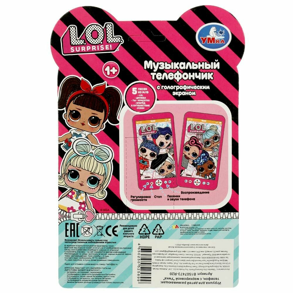 Умка Музыкальный телефон «ЛОЛ» станет отличным подарком для маленьких поклонниц очаровательных модниц: - 5 песен из м/ф (фрагменты): «LOL», «Дружба», «Ты - красотка», «Вперёд в путешествие», «Успех» - звуки телефона - голографический экран - регулировка громкости Вашей малышке непременно понравится этот яркий телефон, она с удовольствием будет слушать весёлые песенки из любимого мультфильма и звуки. Компактную игрушку удобно брать с собой. Музыкальный телефон развивает: - память - слуховое восприятие и музыкальный слух - тактильные навыки - визуальное восприятие - моторику Размер: 8 х 15 х 1 см Материал: пластмасса Работает от 2 - х батареек типа АА (в комплекте) Возраст: детям от 1 года