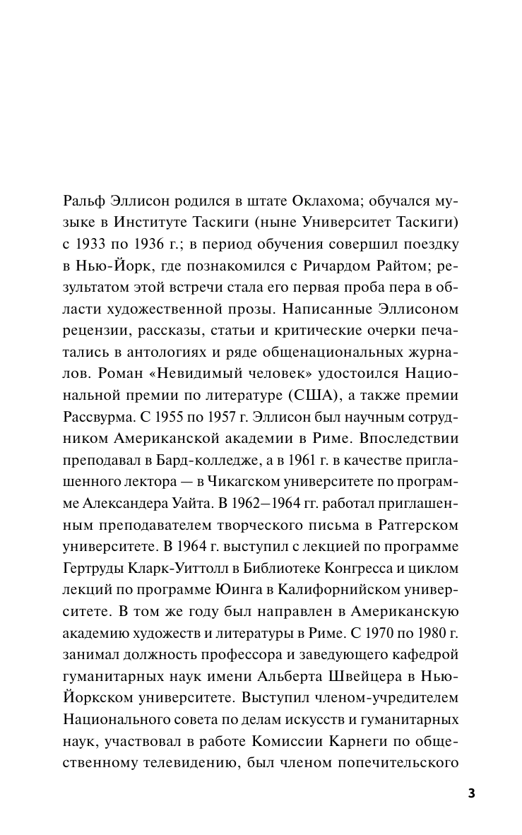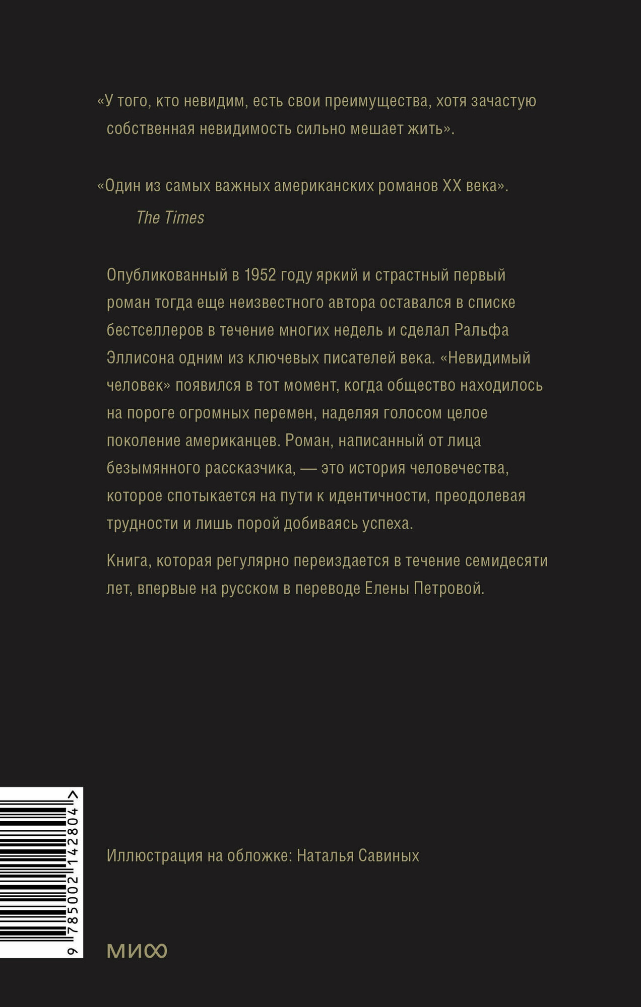 Опубликованный в 1952 году яркий и страстный первый роман тогда еще неизвестного автора оставался в списке бестселлеров в течение многих недель и сделал Ральфа Эллисона одним из ключевых писателей XX века. "Невидимый человек" появился в тот момент, когда общество находилось на пороге огромных перемен, наделяя голосом целое поколение американцев. Роман, написанный от лица безымянного рассказчика, — это история человечества, которое спотыкается на пути к идентичности, преодолевая трудности и лишь порой добиваясь успеха. Книга, которая регулярно переиздается в течение семидесяти лет, впервые на русском в переводе Елены Петровой.
