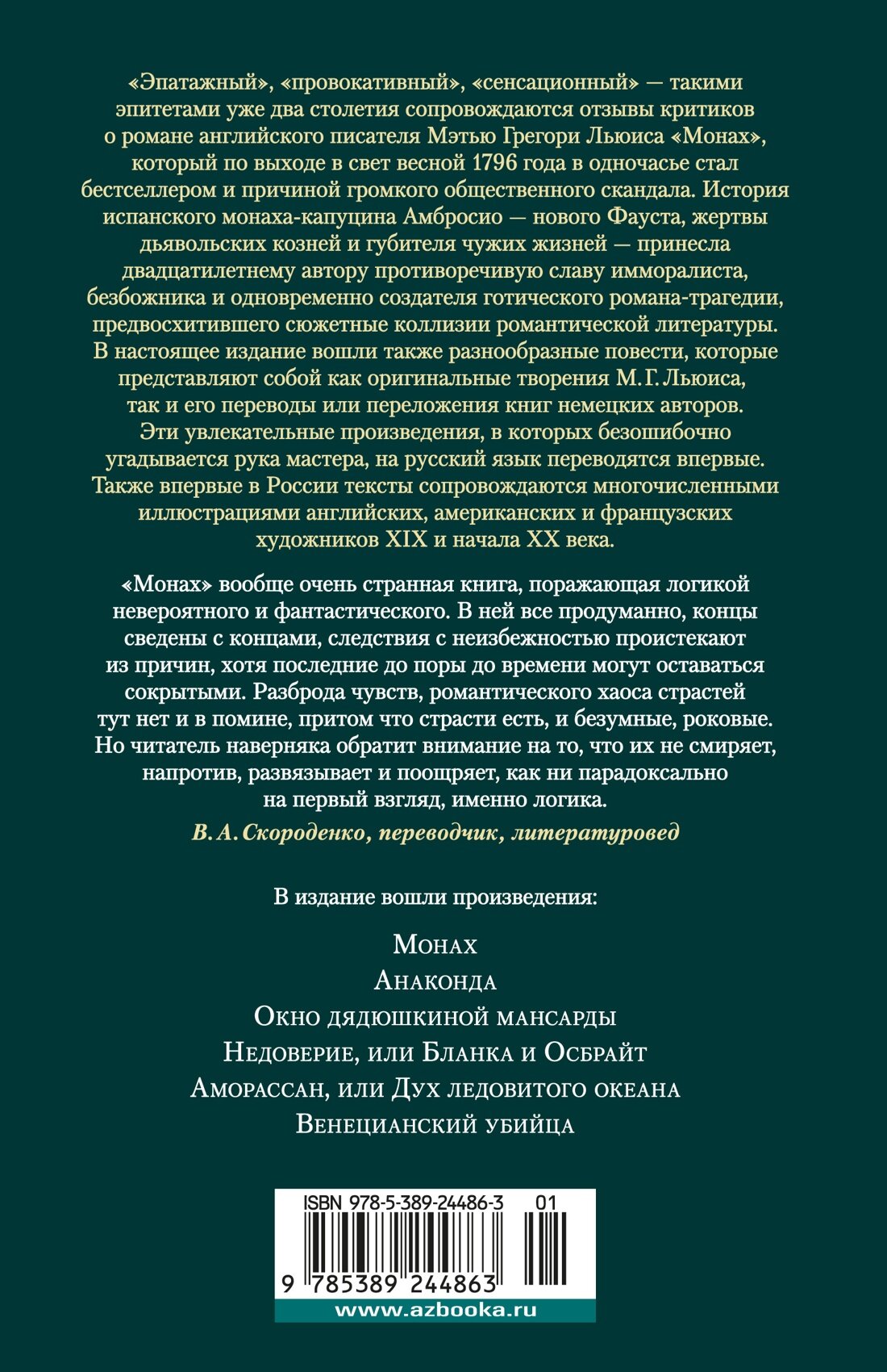 «Эпатажный», «провокативный», «сенсационный» — такими эпитетами уже два столетия сопровождаются отзывы критиков о романе английского писателя Мэтью Грегори Льюиса «Монах», который по выходе в свет весной 1796 года в одночасье стал бестселлером и причиной громкого общественного скандала. История испанского монаха-капуцина Амбросио — нового Фауста, жертвы дьявольских козней и губителя чужих жизней — принесла двадцатилетнему автору противоречивую славу имморалиста, безбожника и одновременно создателя готического романа-трагедии, предвосхитившего сюжетные коллизии романтической литературы. В настоящее издание вошли также разнообразные повести, которые представляют собой как оригинальные творения М. Г. Льюиса, так и его переводы или переложения книг немецких авторов. Эти увлекательные произведения, в которых безошибочно угадывается рука мастера, на русский язык переводятся впервые. Также впервые в России тексты сопровождаются многочисленными иллюстрациями английских, американских и французских художников XIX и начала XX века.