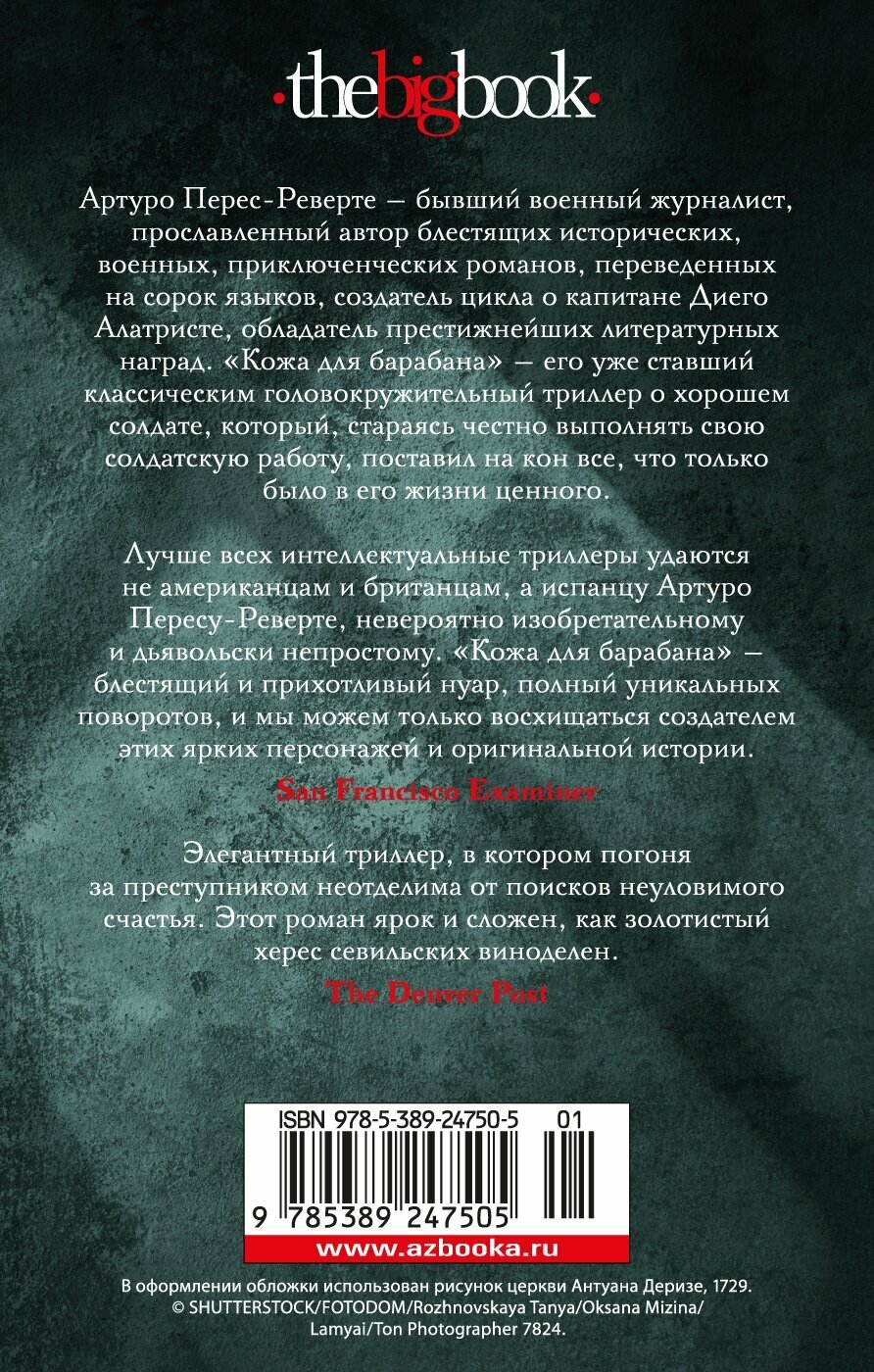 Неизвестный хакер проникает в личный компьютер папы римского и оставляет сообщение о севильской церкви, которая «убивает, чтобы себя защитить». Секретная служба Ватикана отряжает в Севилью Лоренцо Куарта, эмиссара Института внешних дел, и в поисках таинственного хакера тот погружается в хитросплетения церковной политики, большого бизнеса и коррупции: детективное расследование затягивает его, плотские соблазны манят и опасность грозит не только его жизни, но и его вере и обетам… Артуро Перес-Реверте — бывший военный журналист, прославленный автор блестящих исторических, военных, приключенческих романов, переведенных на сорок языков, создатель цикла о капитане Диего Алатристе, обладатель престижнейших литературных наград. «Кожа для барабана» — его уже ставший классическим головокружительный триллер о хорошем солдате, который, стараясь честно выполнять свою солдатскую работу, поставил на кон все, что только было в его жизни ценного.