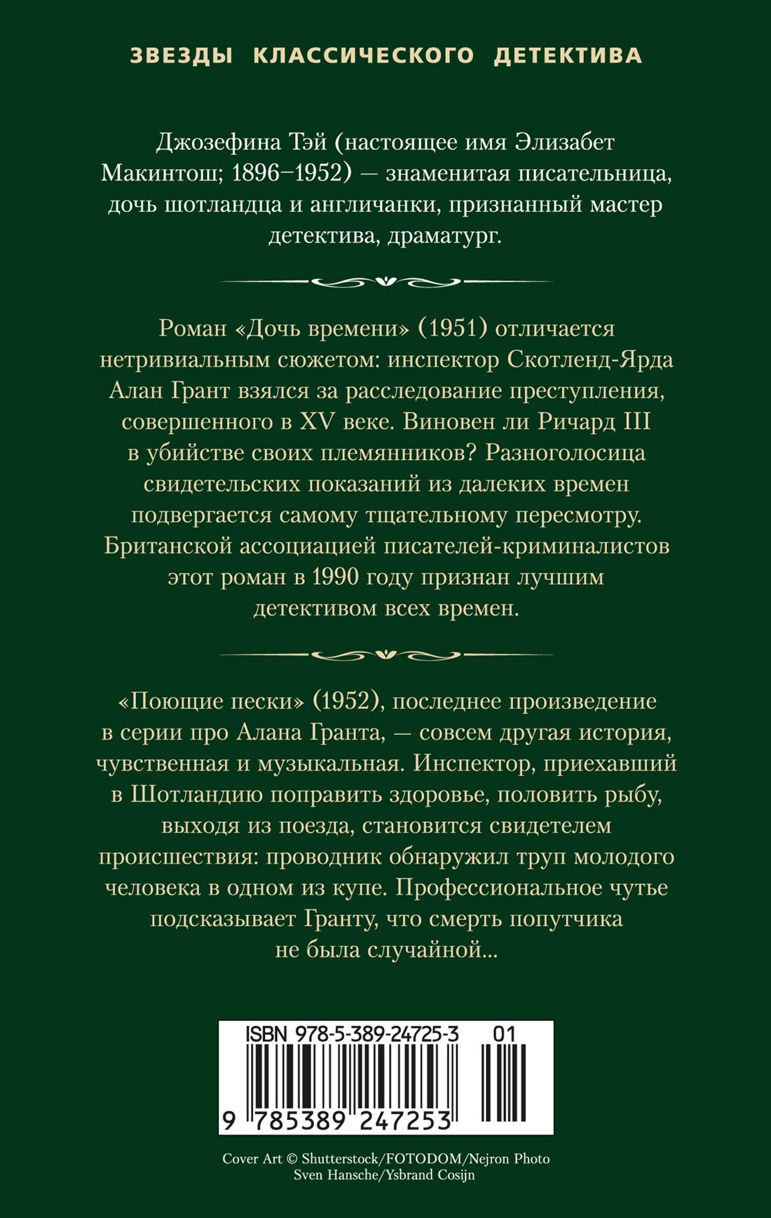 Джозефина Тэй (наст. имя Элизабет Макинтош; 1896–1952) — знаменитая писательница, дочь шотландца и англичанки, признанный мастер детектива, драматург. Роман «Дочь времени» (1951) отличается нетривиальным сюжетом: инспектор Скотленд-Ярда Алан Грант взялся за расследование преступления, совершенного в XV веке. Виновен ли Ричард III в убийстве своих племянников? Разноголосица свидетельских показаний из далеких времен подвергается самому тщательному пересмотру. Британской ассоциацией писателей-криминалистов этот роман в 1990 году признан лучшим детективом всех времен. «Поющие пески» (1952), последнее произведение в серии про Алана Гранта, — совсем другая история, чувственная и музыкальная. Инспектор, приехавший в Шотландию поправить здоровье, половить рыбу, выходя из поезда, становится свидетелем происшествия: проводник обнаружил труп молодого человека в одном из купе. Профессиональное чутье подсказывает Гранту, что смерть попутчика не была случайной...