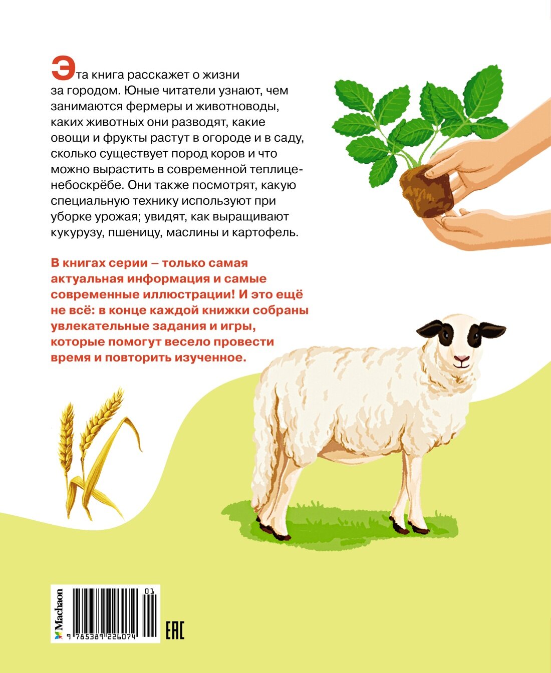 Эта книга расскажет о жизни за городом. Юные читатели узнают, чем занимаются фермеры и животноводы, каких животных они разводят, какие овощи и фрукты растут в огороде и в саду, сколько существует пород коров и что можно вырастить в современной теплице- небоскрёбе. Они также посмотрят, какую специальную технику используют при уборке урожая; увидят, как выращивают кукурузу, пшеницу, маслины и картофель. В книгах серии – только самая актуальная информация и самые современные иллюстрации! И это ещё не всё: в конце каждой книжки собраны увлекательные задания и игры, которые помогут весело провести время и повторить изученное.