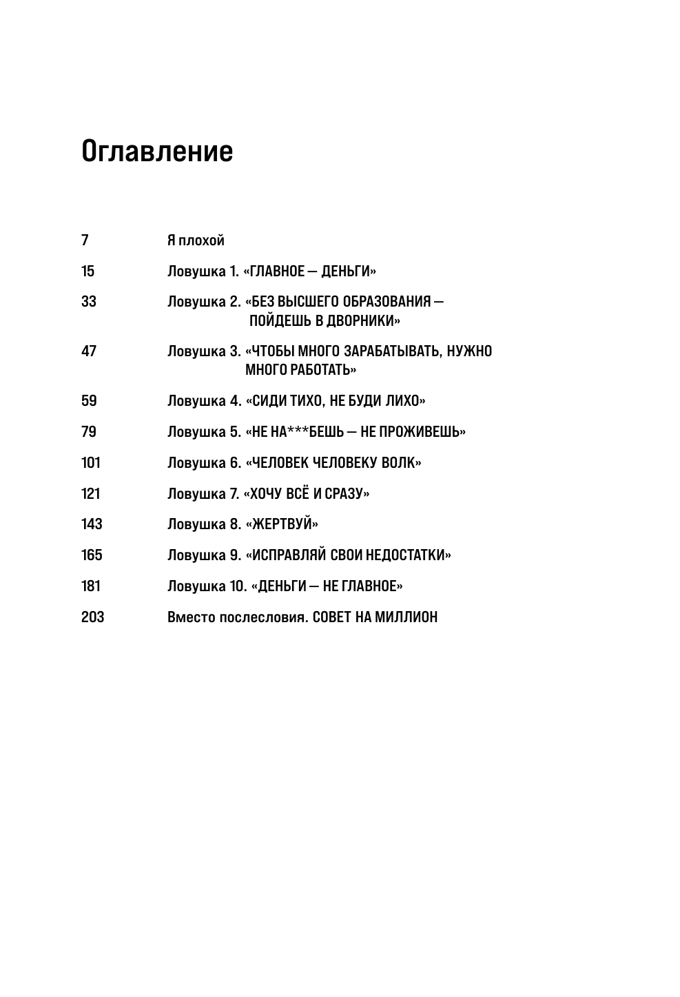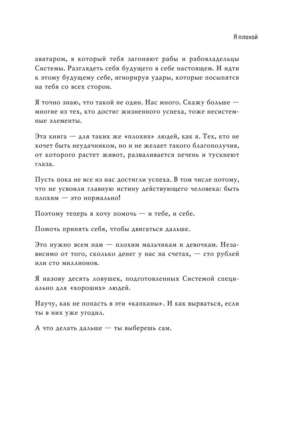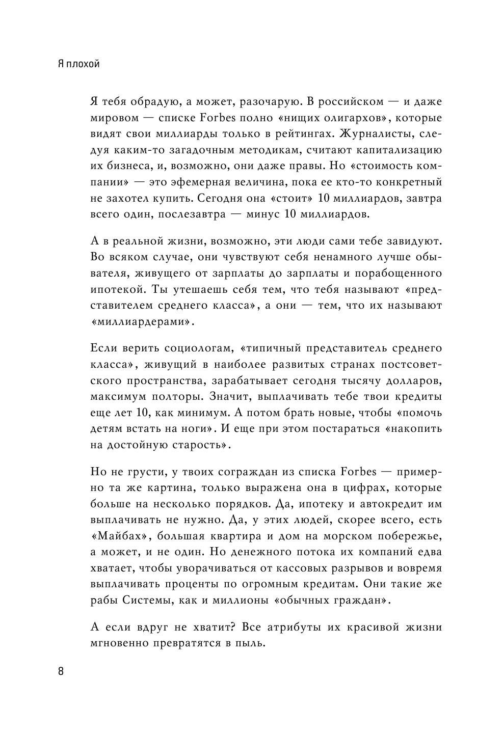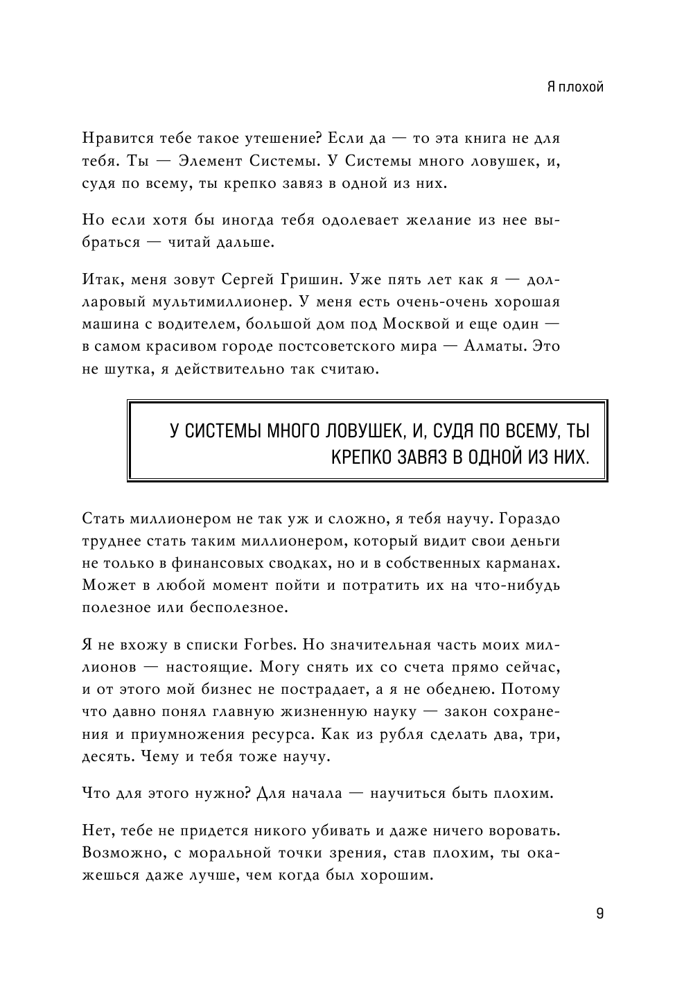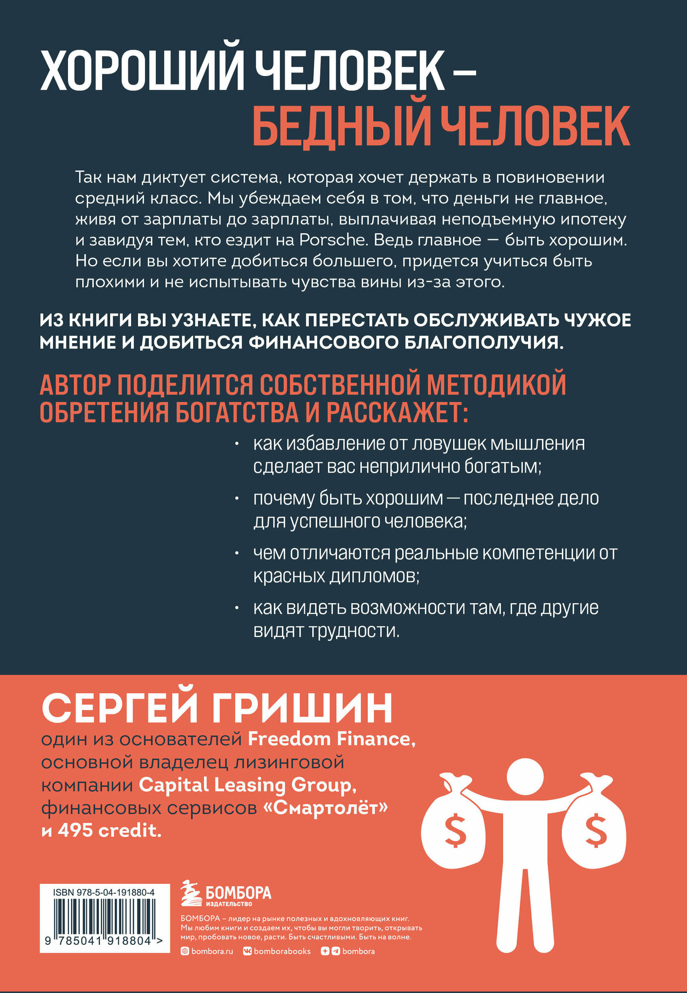 Хороший человек – бедный человек Так нам диктует система, которая хочет держать в повиновении средний класс. Мы убеждаем себя в том, что деньги не главное, живя от зарплаты до зарплаты, выплачивая неподъемную ипотеку и завидуя тем, кто ездит на Porsche. Ведь главное – быть хорошим. Но если вы хотите добиться большего, придется учиться быть плохими и не испытывать чувство вины из-за этого. Сергей Гришин – один из основателей и член совета директоров инвестиционной компании Freedom Finance, совладелец лизинговой компании Capital Leasing Group, серийный предприниматель и инвестор. Из книги вы узнаете, как перестать обслуживать чужое мнение и добиться финансового благополучия. Автор поделится собственной методикой обретения богатства и расскажет: • как избавление от ловушек мышления сделают вас неприлично богатым; • почему быть хорошим — последнее дело для успешного человека; • чем отличаются реальные компетенции от красных дипломов; • как видеть возможности там, где другие видят трудности.