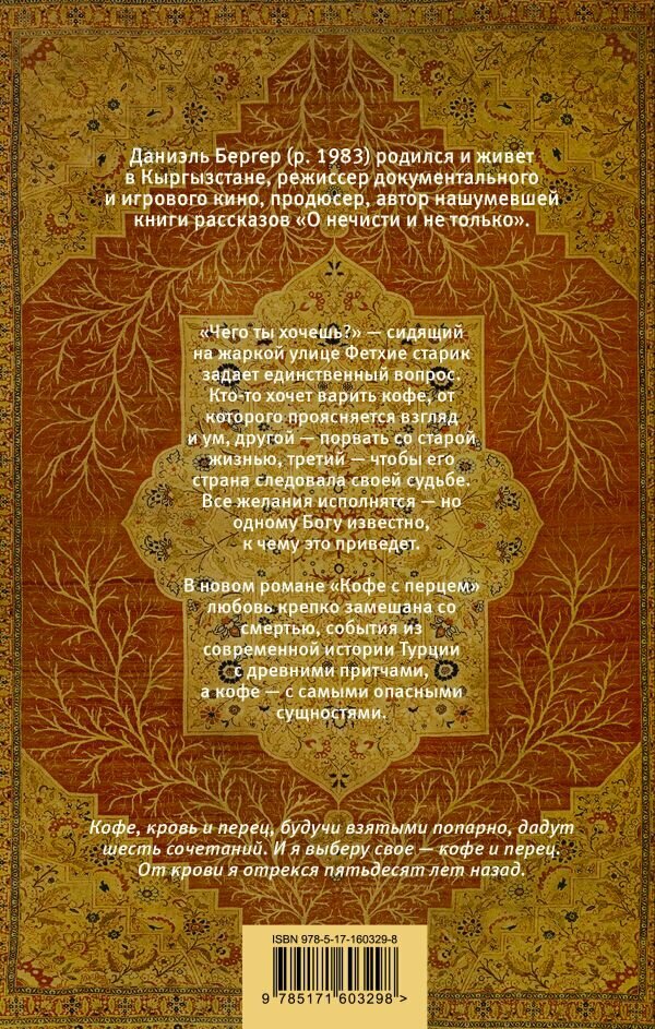 В новом романе Даниэля Бергера «Кофе с перцем» любовь крепко замешана со смертью, события из современной истории Турции с древними притчами, а кофе — с самыми опасными сущностями. «Чего ты хочешь?» — сидящий на жаркой улице Фетхие старик задает единственный вопрос. Один хочет варить кофе, от которого проясняется взгляд и ум, другой — порвать со старой жизнью, третий, чтобы его страна следовала своей судьбе. Все желания исполнятся — но одному Богу известно, к чему это приведет.