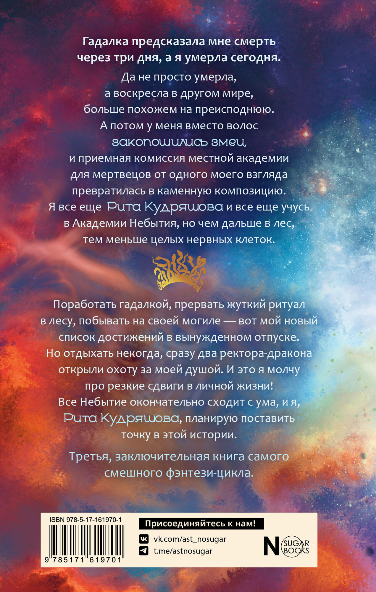 Заключительная часть самой необычной фэнтези-истории с элементами детектива и комедии в интерьерах магической академии и загробного мира. Жизнь Риты Кудряшовой, а точнее, Риты Змеешовой, круто изменилась, когда она стала студенткой загробной академии, но вот сейчас Небытие подкидывает все новые и новые сюрпризы, справиться с которыми не могут помочь даже друзья. Особенно когда сразу два дракона-ректора желают заполучить себе Ритину душу, чтобы наконец закончить многовековое соревнование. Но у студентки Змеешовой совершенно другие планы на свою душу и свою жизнь, какой бы она теперь ни была.