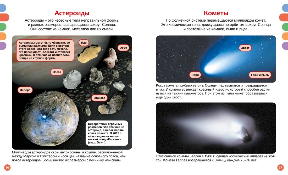 Эта книга расскажет о том, как устроена наша Солнечная система. Юные читатели узнают множество интересных фактов о космосе, поймут, чем различаются планеты, что такое спутники, кометы и астероиды, а также познакомятся с самыми удачными научными миссиями – от первого полёта человека в космос до отправки исследовательских зондов к другим планетам. В книгах серии – только самая актуальная информация и самые современные иллюстрации! И это ещё не всё: в конце каждой книжки собраны увлекательные задания и игры, которые помогут весело провести время и повторить изученное.