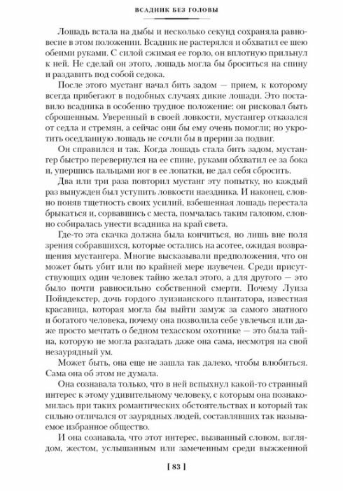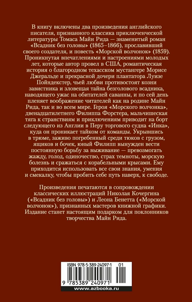 В книгу включены два произведения английского писателя, признанного классика приключенческой литературы Томаса Майн Рида – знаменитый роман «Всадник без головы» (1865–1866), прославивший своего создателя, и повесть «Морской волчонок» (1859). Проникнутая впечатлениями и настроениями молодых лет, которые автор провел в США, романтическая история о благородном техасском мустангере Морисе Джеральде и прекрасной дочери плантатора Луизе Пойндекстер, чьей любви противостоят козни завистника и зловещая тайна безголового всадника, наводящего ужас на обитателей саванны, и по сей день пленяет воображение читателей как на родине Майн Рида, так и во всем мире. Героя «Морского волчонка», двенадцатилетнего Филиппа Форстера, мальчишеская тяга к странствиям и приключениям приводит на борт следующего из Англии в Перу торгового судна «Инка», куда он проникает тайком от команды. Укрывшись в трюме, заживо погребенный среди тюков с грузом, ящиков и бочек, юный Филипп вынужден вести постоянную борьбу за выживание – превозмогать жажду, голод, одиночество, страх темноты, морскую болезнь и сражаться с корабельными крысами. Ему приходится использовать все свои знания, умения и смекалку, чтобы пробить себе путь наверх, к свободе. Произведения печатаются в сопровождении классических иллюстраций Николая Кочергина («Всадник без головы») и Леона Бенетта («Морской волчонок»).