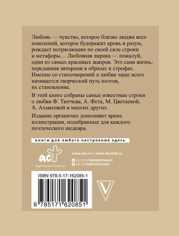 Любовь — чувство, которое близко людям всех поколений, которое будоражит кровь и разум, рождает потрясающие по своей силе строки и метафоры… Любовная лирика — пожалуй, один из самых красивых жанров. Это сама жизнь, переданная авторами в образах и строфах. Именно со стихотворений о любви чаще всего начинается творческий путь поэтов, их становление. В этой книге собраны самые известные строки о любви Ф. Тютчева, А. Фета, М. Цветаевой, А. Ахматовой и многих других. Издание органично дополняют яркие иллюстрации, подобранные для каждого поэтического шедевра.