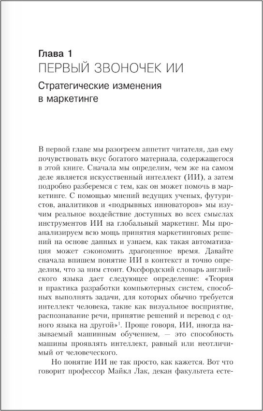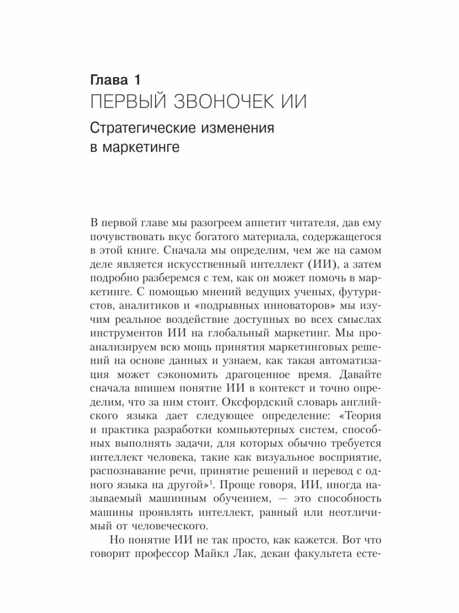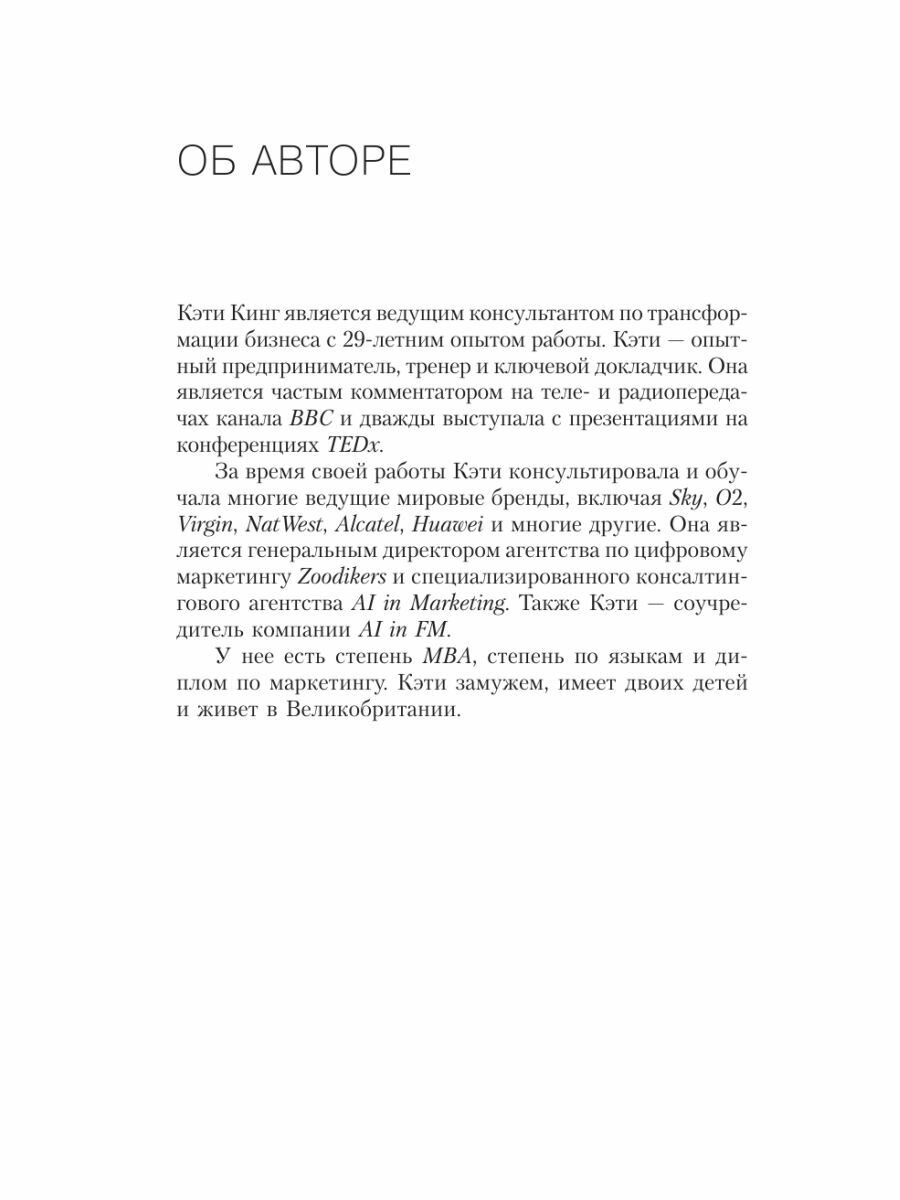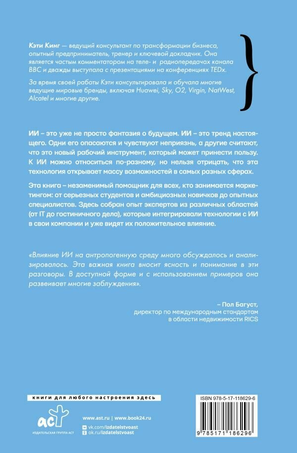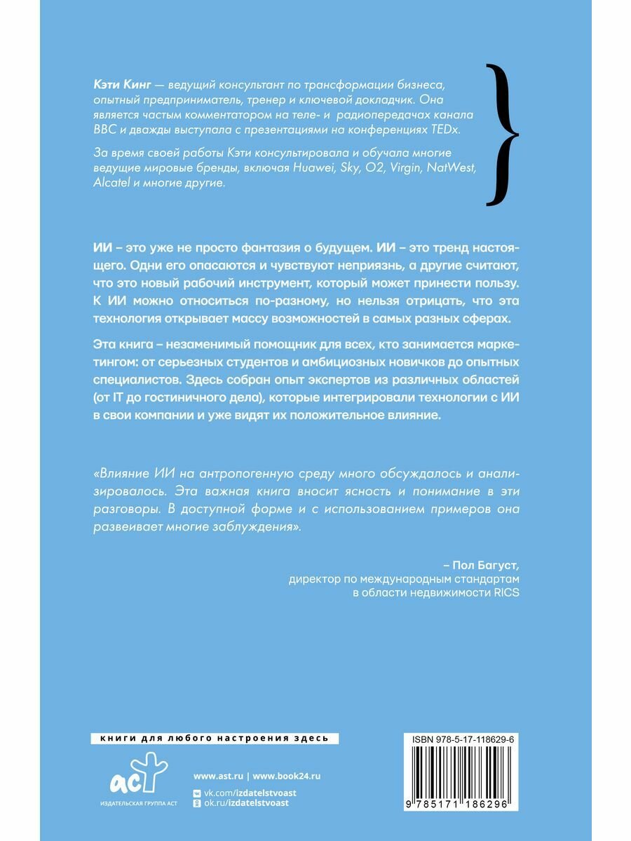ИИ - это уже не просто фантазия о будущем. ИИ - это тренд настоящего. Одни его опасаются и чувствуют неприязнь, а другие считают, что это новый рабочий инструмент, который может принести пользу. К ИИ можно относиться по-разному, но невозможно отрицать, что эта технология открывает массу возможностей в самых разных сферах. Эта книга - незаменимый помощник для всех, кто занимается маркетингом: от серьезных студентов и амбициозных новичков до опытных специалистов. Здесь собран опыт экспертов из различных областей (от IT до гостиничного дела), которые интегрировали технологии с ИИ в свои компании и уже видят их положительное влияние. Кэти Кинг - ведущий консультант по трансформации бизнеса, опытный предприниматель, тренер и ключевой докладчик. Она является частым комментатором на теле- и радиопередачах канала BBC и дважды выступала с презентациями на конференциях TEDx. За время своей работы Кэти консультировала и обучала многие ведущие мировые бренды, включая Huawei, Sky, O2, Virgin, NatWest, Alcatel и многие другие. "Влияние ИИ на антропогенную среду много обсуждалось и анализировалось. Эта важная книга вносит ясность и понимание в эти разговоры. В доступной форме и с использованием примеров, она развеивает многие заблуждения". - Пол Багуст, директор по международным стандартам в области недвижимости RICS.