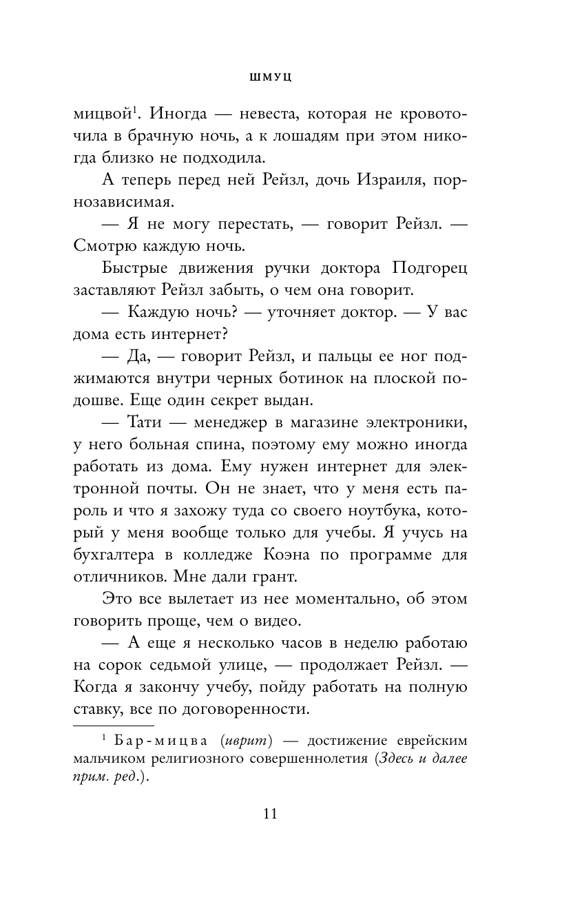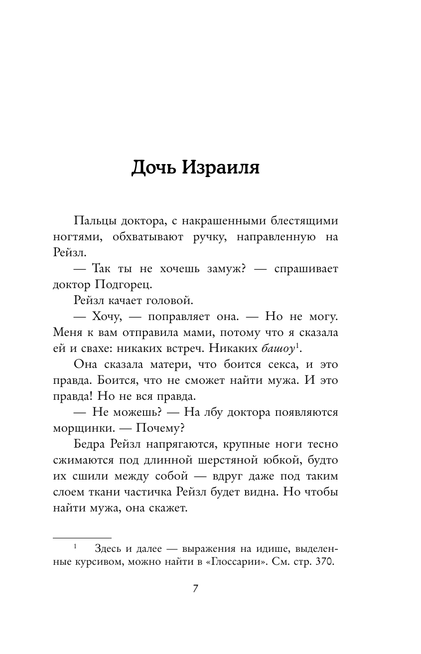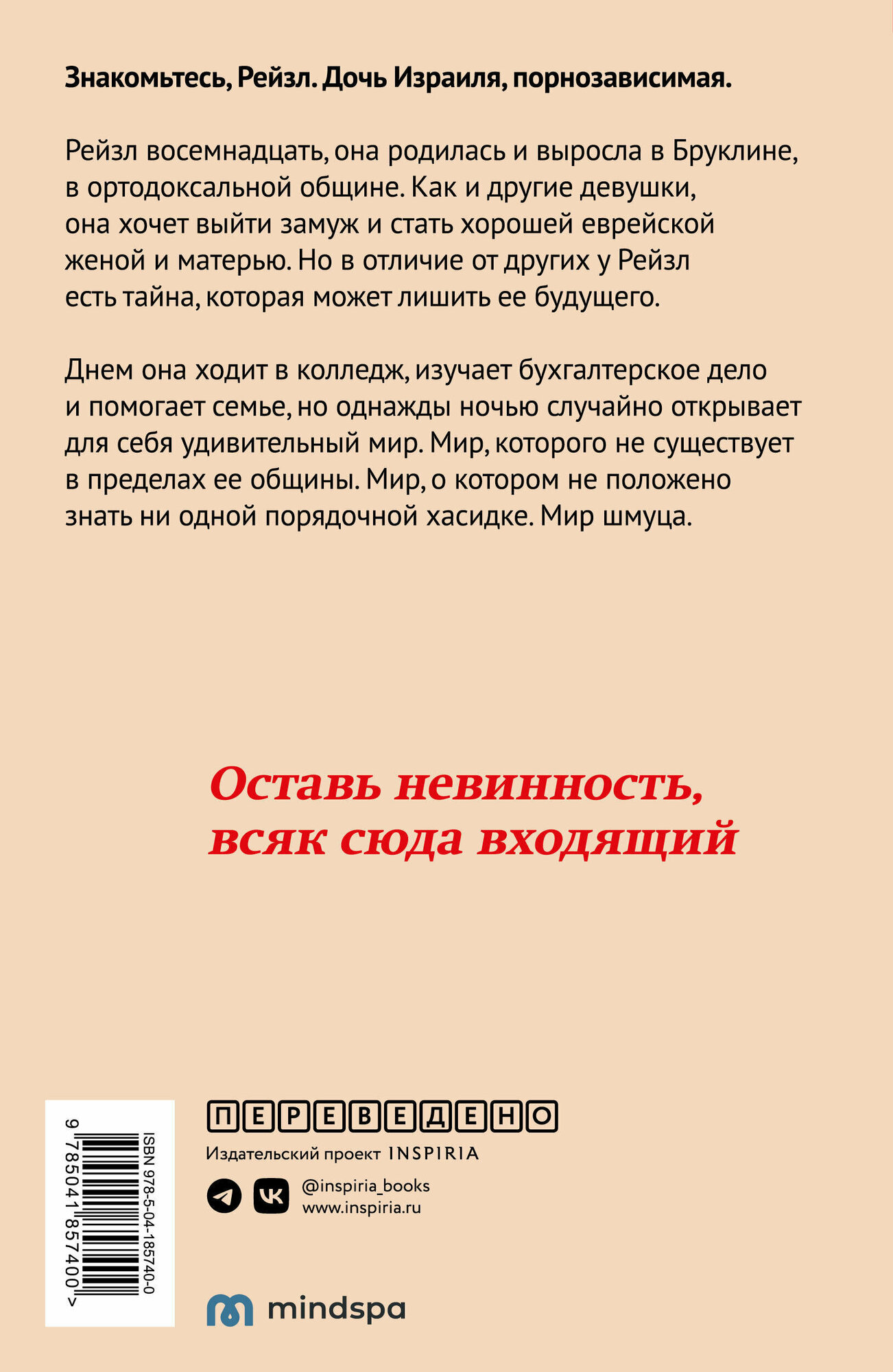 Днем Рейзл изучает бухгалтерское дело и помогает семье, а по ночам тайком от всех она открывает для себя удивительный мир. Мир, которого не существует в пределах ее общины. Мир, о котором не положено знать ни одной дочери Израиля. Мир шмуца.