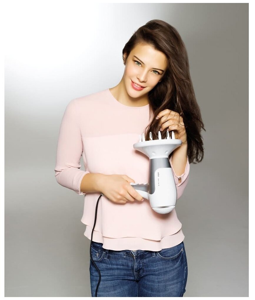 Satin Hair 5 PowerPerfection HD585 - вы не поверите, что такой компактный и легкий фен может быть настолько мощным. С феном Braun Satin Hair 5 мощностью 2500 Ватт у тебя есть возможность легко и тщательно высушить свои волосы, а самое главное — быстро. Экономьте время и хватит тратить время на ожидание: Вы будете поражены тем, насколько быстрой может быть сушка волос благодаря фену от Braun. Теперь от мокрых волос к эффекту «Вау!» один шаг. Фены Braun Satin Hair PowerPerfection — это удивительное сочетание веса и мощности. Благодаря невесомости и компактному дизайну этот эргономичный фен удобно разворачивается во все стороны, и больше не будет недосушенных мест. Фен наделен функцией ионизации. Миллионы активных ионов борются со статическим электричеством, возникающим у обычных фенов. Волосы становятся более ровными и гладкими, излучая заметно больше блеска.