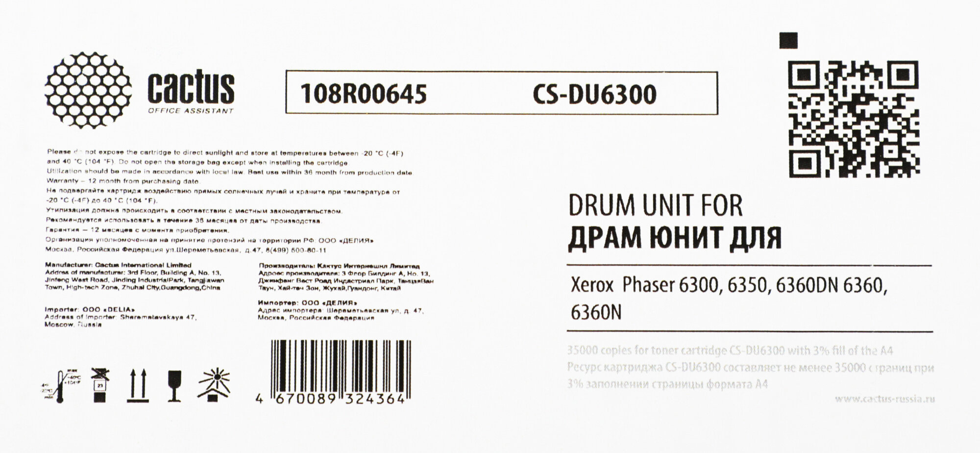 Блок фотобарабана Cactus 108R00645 черный ч/б:35000стр. для Phaser 6300 6350 6360DN 6360 6360N Xerox CS-DU6300