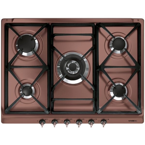 Варочная панель Smeg цвета «медь» — стиль и практичность. Данная модель гармонично сочетается с бытовой техникой коллекции Smeg Coloniale. С помощью поворотных переключателей можно легко и точно выбрать параметры работы прибора. Газ-контроль перекрывает подачу газа, если пламя случайно гаснет, а чугунные решетки обеспечивают устойчивое положение посуды на рабочей поверхности, что гарантирует безопасность эксплуатации.
