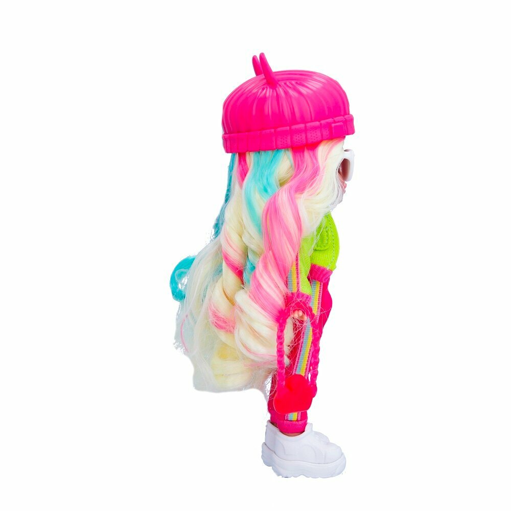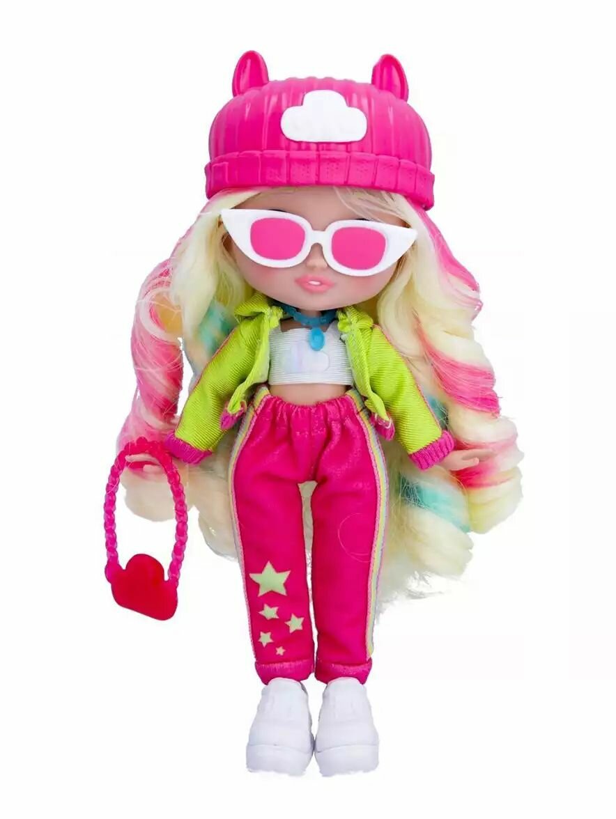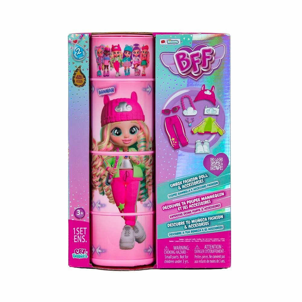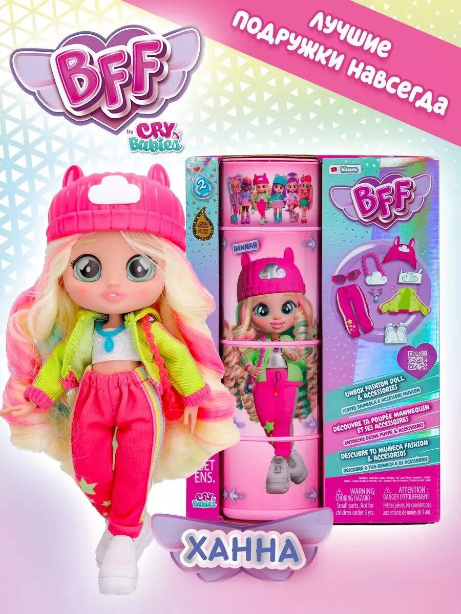 Милые девочки Край Бебис повзрослели! Теперь они "БФФ - Лучшие друзья навсегда" - коллекционные модные куклы и персонажи одноименного мультсериала! Лучшие друзья приехали в летний лагерь талантов, где активно участвуют в занятиях по искусству, музыке и робототехнике. Но злодейка Шедоу постоянно строит козни против девочек. Что это за стильная девчонка? Ханна - блондинка с шелковистыми волосами и разноцветными прядками. Она одета в модный наряд: неоновая толстовка, спортивные штаны со зведами в цвет толстовки, топ и кеды. Ее стильный образ можно дополнить модной сумочкой, шапочкой бини с ушками, очками в стиле ретро и особенным волшебным ожерельем БФФ. Ханна очень понимающая: она постоянно заботится о своих друзьях и хочет, чтобы они все время были счастливы. Ханна умеет летать, и ее навыкам может позавидовать каждый!Смогут ли БФФ объединиться и остановить Шедоу силой своей дружбы?БФФ - дружба сильнее тьмы! Ханна БФФ - кукла высотой 20 см с длинными мягкими прошитыми волосами, яркой одеждой, с подвижными ручками и ножками (11 точек артикуляции). В наборе модная кукла, комплект одежды, сумка, головной убор, пара обуви, ожерелье, коллекционный буклет. Игрушка изготовлена из полимерных и текстильных материалов. Товар сертифицирован и безопасен для детского использования. Упаковка: закрытая коробка 18,5 х 6 х 27 см.