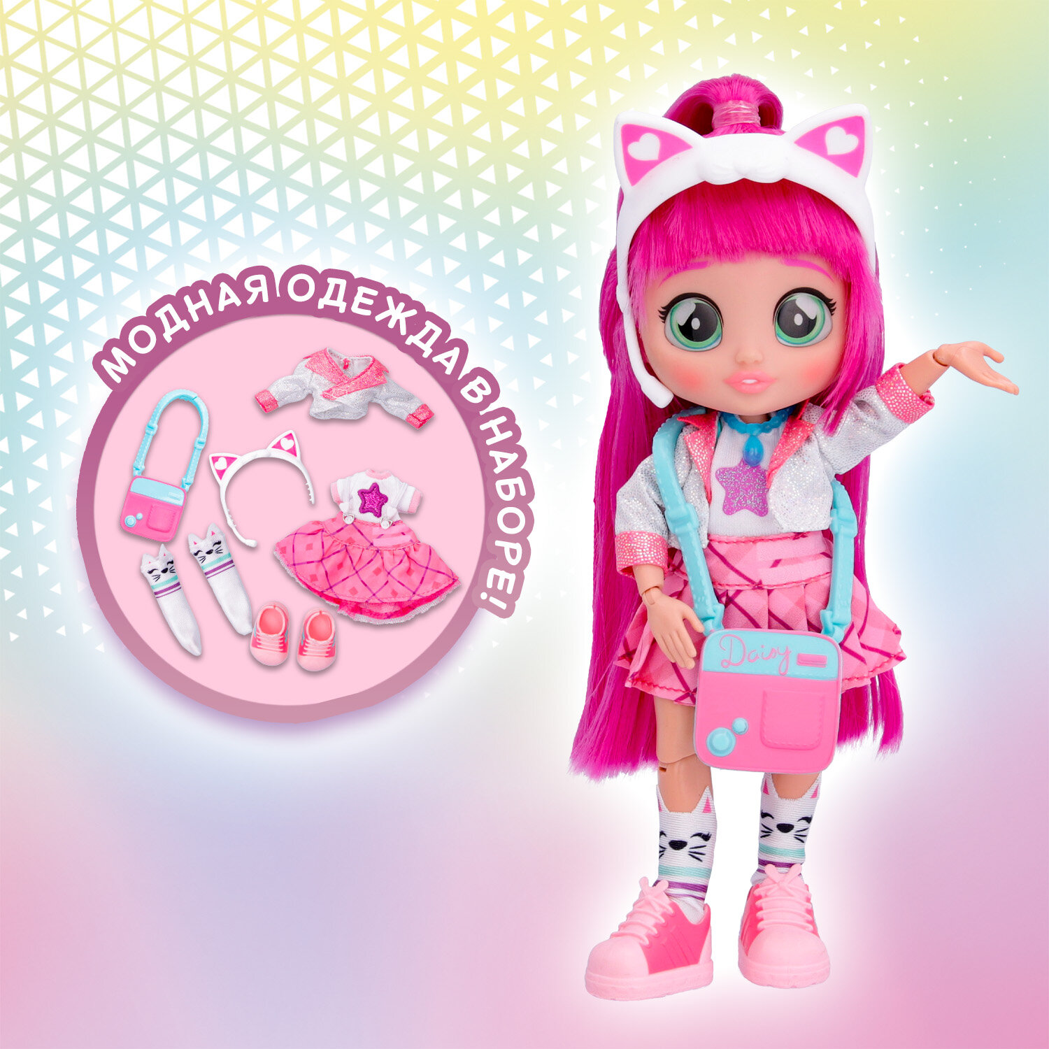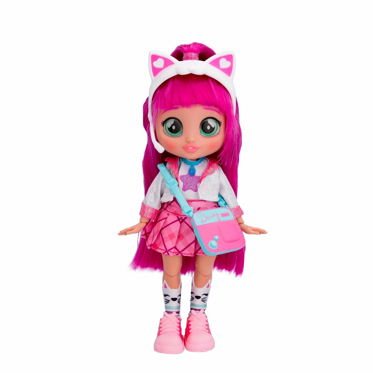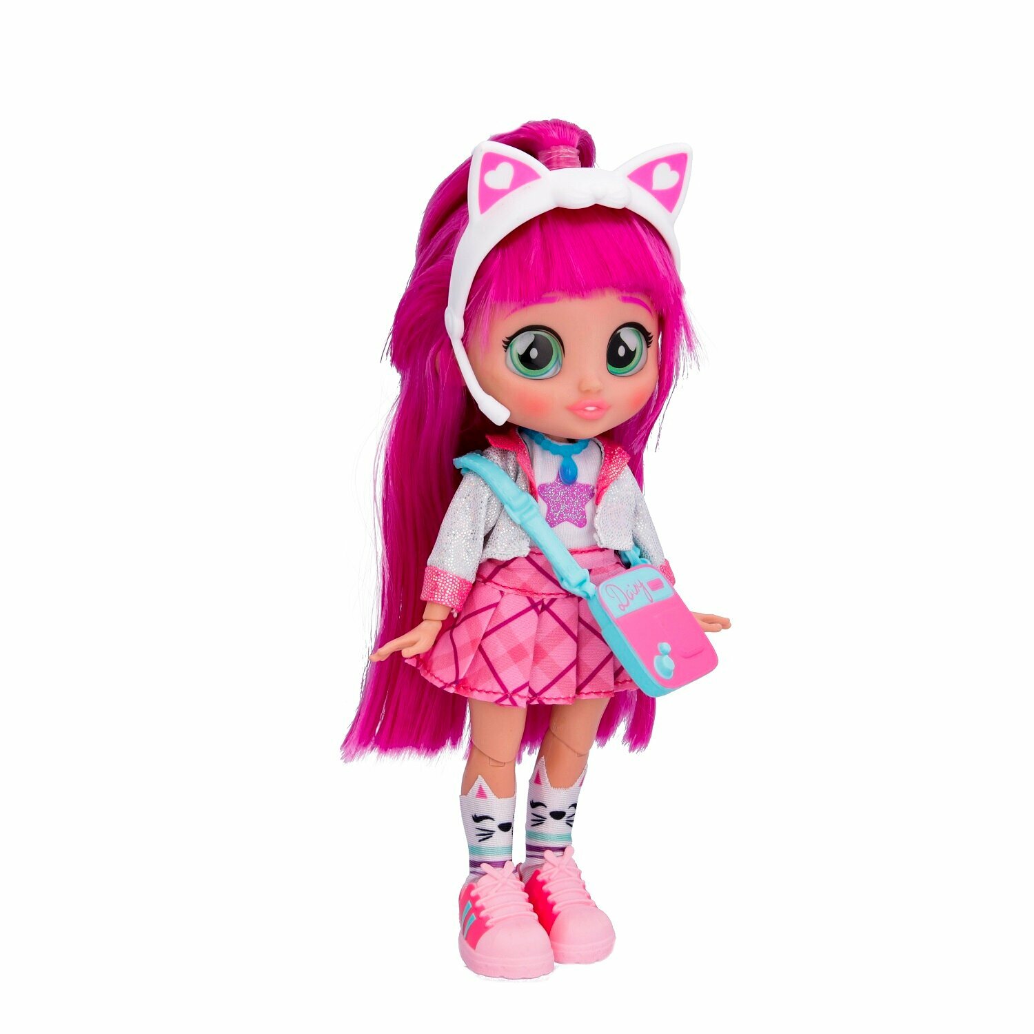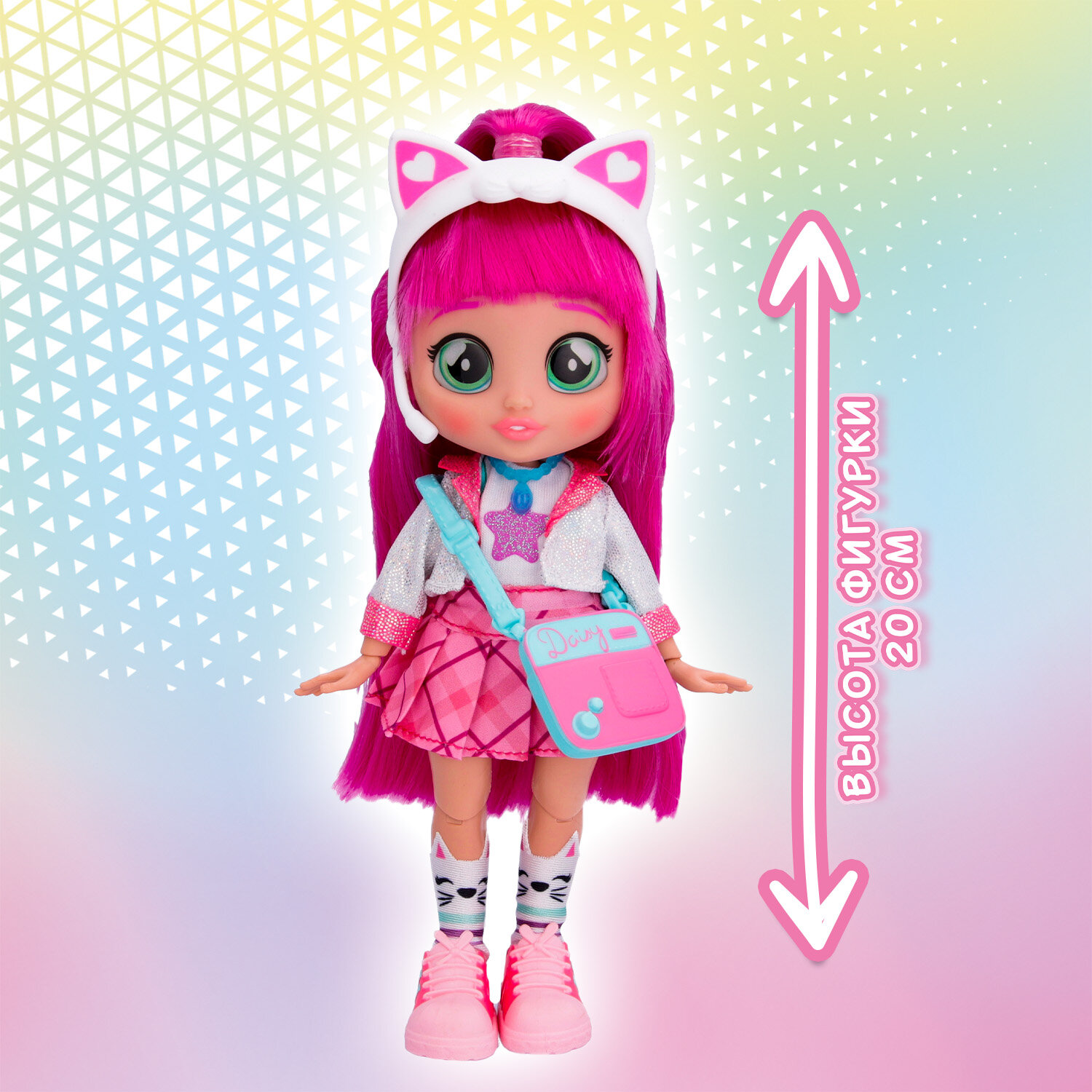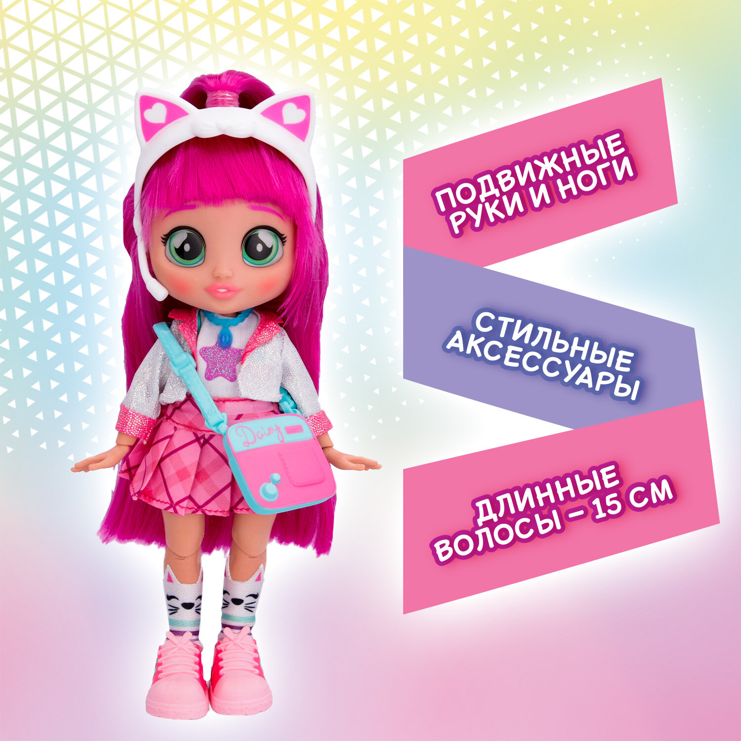 Милые девочки Край Бебис повзрослели! Теперь они "БФФ - Лучшие друзья навсегда" - коллекционные модные куклы и персонажи одноименного мультсериала! Лучшие друзья приехали в летний лагерь талантов, где активно участвуют в занятиях по искусству, музыке и робототехнике. Но злодейка Шедоу постоянно строит козни против девочек. Что это за стильная девчонка? У Дейзи шелковистые яркие волосы и большие зеленые глаза. Она одета в модный наряд: концертное платье с пиджаком, розовые кеды и милые носочки с котиками. Ее стильный образ можно дополнить именной сумочкой, ободком с ушками котика и особенным волшебным ожерельем БФФ. Дейзи обожает петь, и у нее это отлично получается! Дома она устраивает репетиции на своей импровизированной сцене. Ей нравится петь и для других, поэтому она часто устраивает концерты для своих подружек БФФ. Смогут ли БФФ объединиться и остановить Шедоу силой своей дружбы?БФФ - дружба сильнее тьмы! Дейзи БФФ - кукла высотой 20 см с длинными мягкими прошитыми волосами, яркой одеждой, с подвижными ручками и ножками (11 точек артикуляции). В наборе модная кукла, комплект одежды, сумка, головной убор, пара обуви, ожерелье, коллекционный буклет. Игрушка изготовлена из полимерных и текстильных материалов. Товар сертифицирован и безопасен для детского использования. Упаковка: закрытая коробка 18,5 х 6 х 27 см.