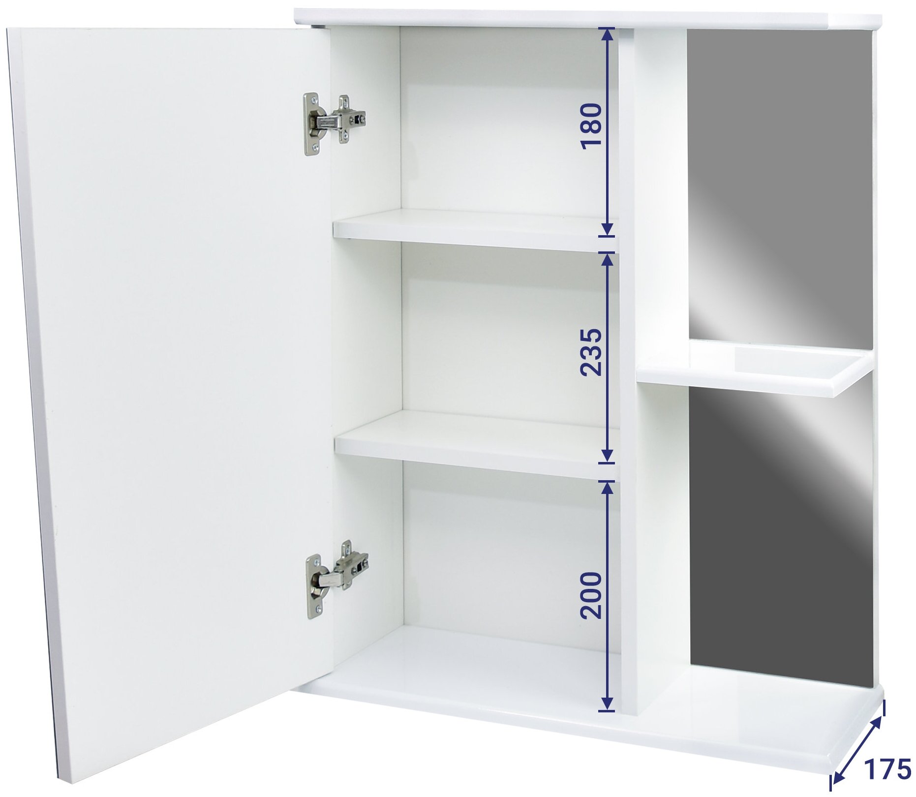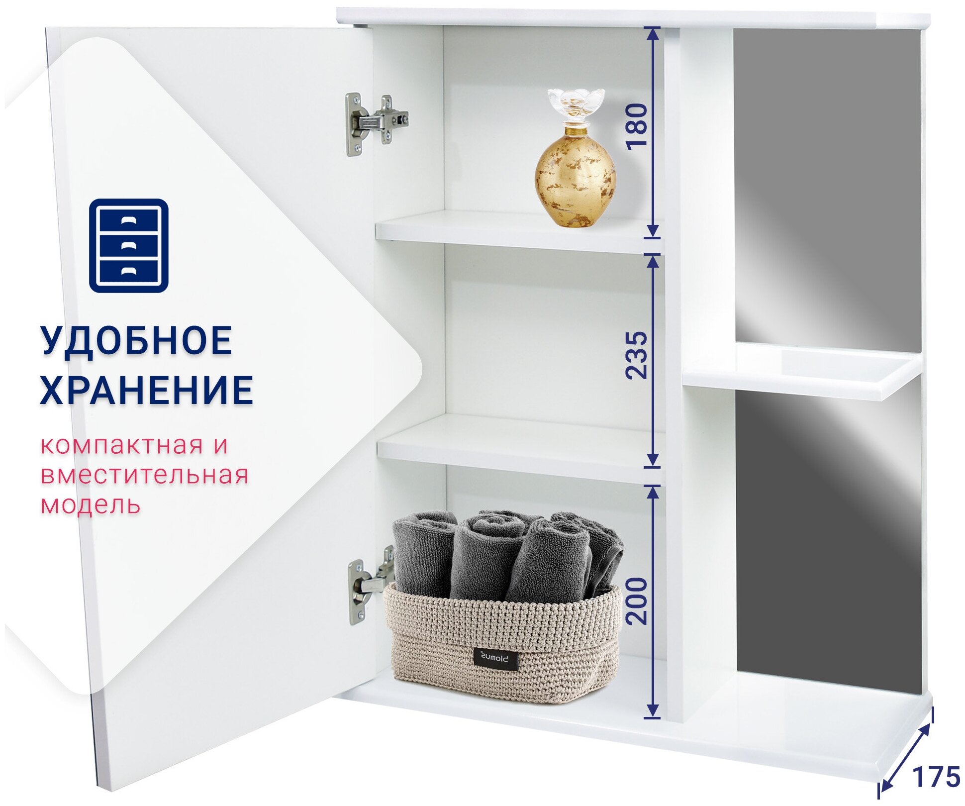 Зеркало со шкафом Парус 55 белый, левый DORATIZ 2711.090Зеркало-шкаф Парус - идеальное сочетание безупречного исполнения и современного дизайна. Эта компактная, но при этом вместительная модель станет гармоничным дополнением интерьера Вашей ванной комнаты, а оригинальная форма фасада подчеркнет Ваш уникальный стиль. За зеркальным фасадом настенного зеркала-шкафа находится ниша с полками, предназначенная для удобного и компактного хранения косметических и гигиенических принадлежностей. Встроенные в дверцы доводчики порадуют Вас легкостью и плавностью хода, что, безусловно, обеспечит комфортную эксплуатацию. Открытые полки позволят хранить вещи, которые Вы часто используете и желаете иметь всегда под рукой.При изготовлении интерьерного зеркала используются только высококачественные материалы. Отражающее покрытие исключает оптическое искажение очертания объектов, благодаря чему идеально подходит для макияжа. Водоотталкивающая поверхность зеркала имеет защиту от влаги IP 44.Навесной шкаф выполнен из высококачественных древесных материалов. Корпус мебели изготовлен из влагостойкого ламинированного ДСП, что соответствует использованию в помещениях с повышенной влажностью. Края корпусных деталей обработаны высококачественной кромкой со всех сторон, включая тыльную. Фасад также выполнен из ВЛДСП и имеет зеркальное полотно с лицевой стороны. Такое сочетание материалов при изготовлении данной модели выдерживает длительную эксплуатацию без нарушения первоначального внешнего вида. Мебель для ванных комнат DORATIZ соответствует самым строгим отраслевым нормам и стандартам. Мы внимательно следим за качеством выпускаемой продукции. При правильной эксплуатации она прослужит Вам долго и станет неотъемлемой частью Вашей ванной комнаты.Если Вы желаете посмотреть полный ассортимент моделей бренда мебели для ванных комнат DORATIZ, введите поисковый запрос в магазине или смотрите официальный сайт. Мебель DORATIZ изготавливается в РФ в соответствии с ГОСТом 16371-2014. На всю продукцию торговой марки установлен гарантийный срок 1 год.Поставляется зеркало-шкаф в собранном виде и готово к установке. После установки необходимо отрегулировать фурнитуру.Изделие имеет индивидуальную упаковку из трехслойного гофрокартона и воздушно-пузырчатой пленки. Для дополнительной защиты используется стрейч-пленка.