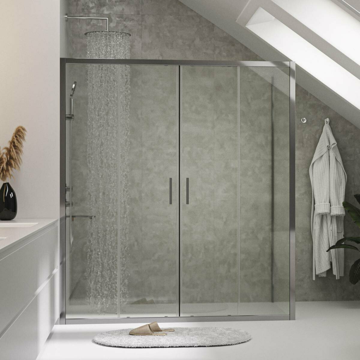 Закаленное прозрачное стекло 6 мм. Раздвижной механизм из сплава металлов. Анодированный алюминиевый профиль 32/34 мм. Ручки дверей из алюминия и ABS-пластика. Регулирующий профиль до 15 мм. Механизм легкой чистки. Силиконовый уплотнитель дверей с магнитным замком. Силиконовые уплотнители.