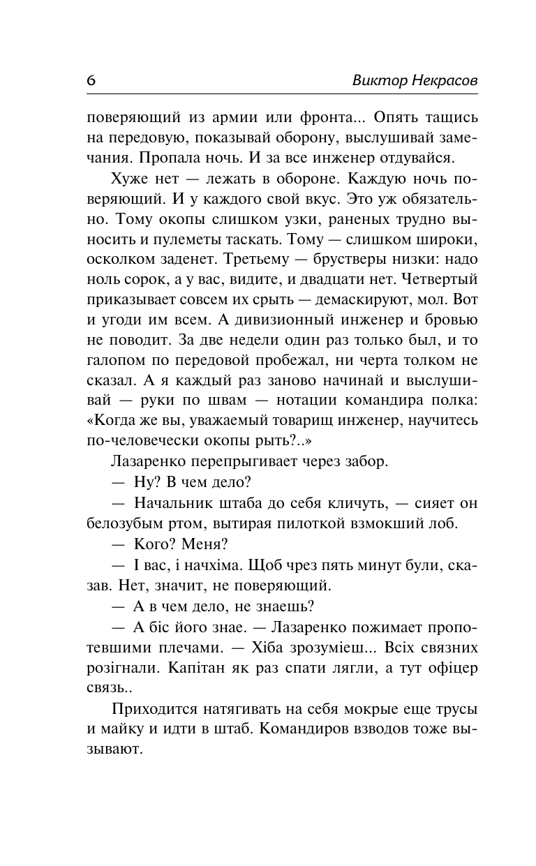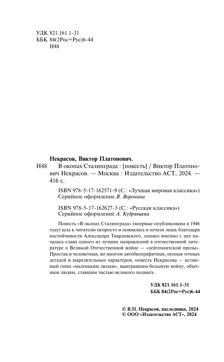 Повесть "В окопах Сталинграда" (впервые опубликована в 1946 году) шла к читателю непросто и появилась в печати лишь благодаря настойчивости Александра Твардовского, однако именно с нее началась слава одного из лучших направлений в отечественной литературе о Великой Отечественной войне — "лейтенантской прозы". Простая и человечная, во многом автобиографичная, полная точных деталей и выразительных характеров, повесть Некрасова — истинный гимн "маленьким людям", выигравшим большую войну, обычным людям, ставшим частью великого подвига.