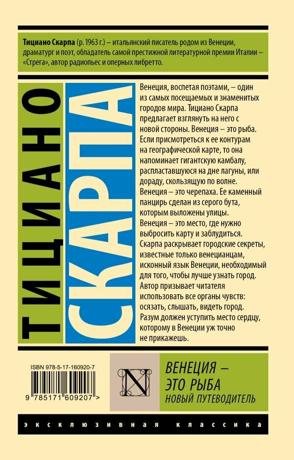 Венеция, воспетая поэтами, – один из самых посещаемых и знаменитых городов мира. Тициано Скарпа предлагает взглянуть на него с новой стороны. Венеция – это рыба. Если присмотреться к ее контурам на географической карте, то она напоминает гигантскую камбалу, распластавшуюся на дне лагуны, или дораду, скользящую по волне.Венеция – это черепаха. Ее каменный панцирь сделан из серого бута, которым выложены улицы. Венеция – это место, где нужно выбросить карту и заблудиться. Скарпа раскрывает городские секреты, известные только венецианцам, исконный язык Венеции, необходимый для того, чтобы лучше узнать город. Автор призывает читателя, использовать все органы чувств: осязать, слышать, видеть, чувствовать город, разум должен уступить место чувствам, а именно сердцу, которому в Венеции уж точно не прикажешь.