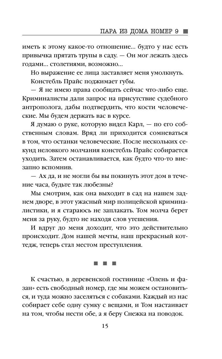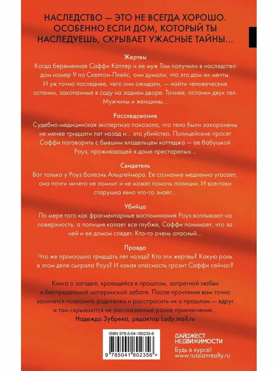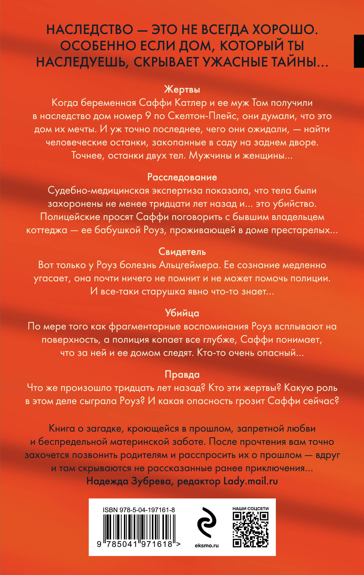 Когда беременная Саффи Катлер и ее муж Том получили в наследство дом номер 9 по Скелтон-Плейс, они думали, что это - дом их мечты. И уж точно последнее, чего они ожидали - найти человеческие останки, закопанные в саду на заднем дворе. Точнее, останки двух тел. Мужчины и женщины. Судебно-медицинская экспертиза показала, что тела были захоронены не менее тридцати лет назад, и. это убийство. Полицейские просят Саффи поговорить с бывшим владельцем коттеджа - ее бабушкой Роуз, проживающей в доме престарелых. Вот только у Роуз болезнь Альцгеймера. Ее сознание медленно угасает, она почти ничего не помнит и не может помочь полиции. И все-таки старушка явно что-то знает. По мере того, как фрагментарные воспоминания Роуз всплывают на поверхность, а полиция копает все глубже, Саффи понимает, что за ней и ее домом следят. Кто-то очень опасный. Что же произошло тридцать лет назад? Кто эти жертвы? Какую роль в этом деле сыграла Роуз? И какая опасность грозит Саффи сейчас? Книга о загадке, кроящейся в прошлом, запретной любви и беспредельной материнской заботе. После прочтения вам точно захочется позвонить родителям и расспросить их о прошлом - вдруг и там скрываются не рассказанные ранее приключения. Надежда Зубрева, редактор Lady.mail