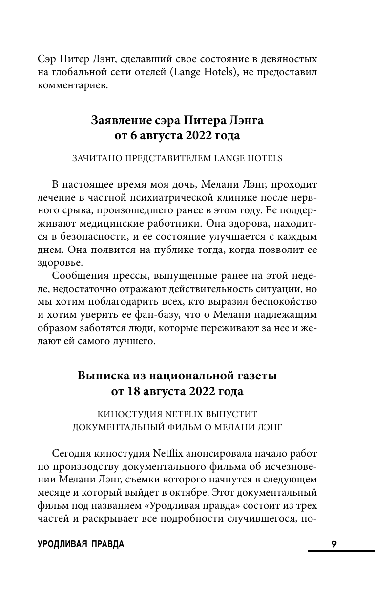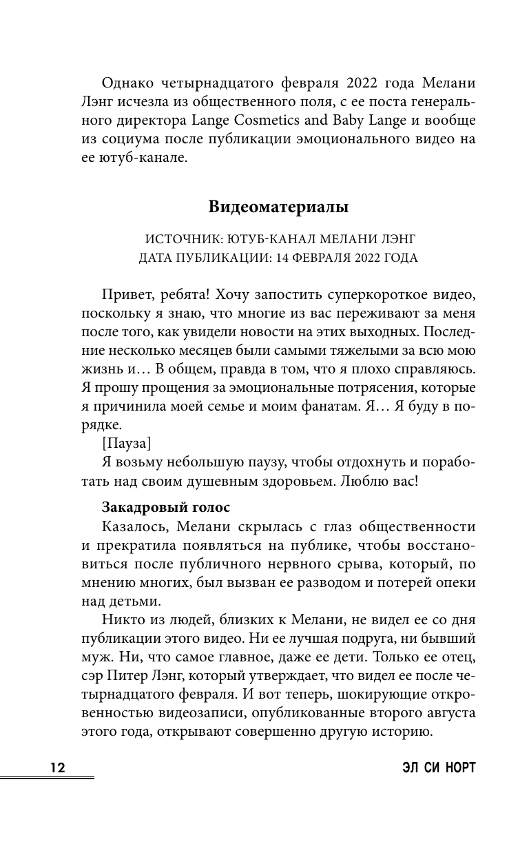 Мелани Лэнг исчезла. Бывшая модель и бизнес-леди просто пропала с радаров папарацци и социальных сетей. Ее отец, бизнесмен и миллионер, сэр Питер Лэнг утверждает, что она представляет опасность для себя самой и поэтому была помещена в специальное место.