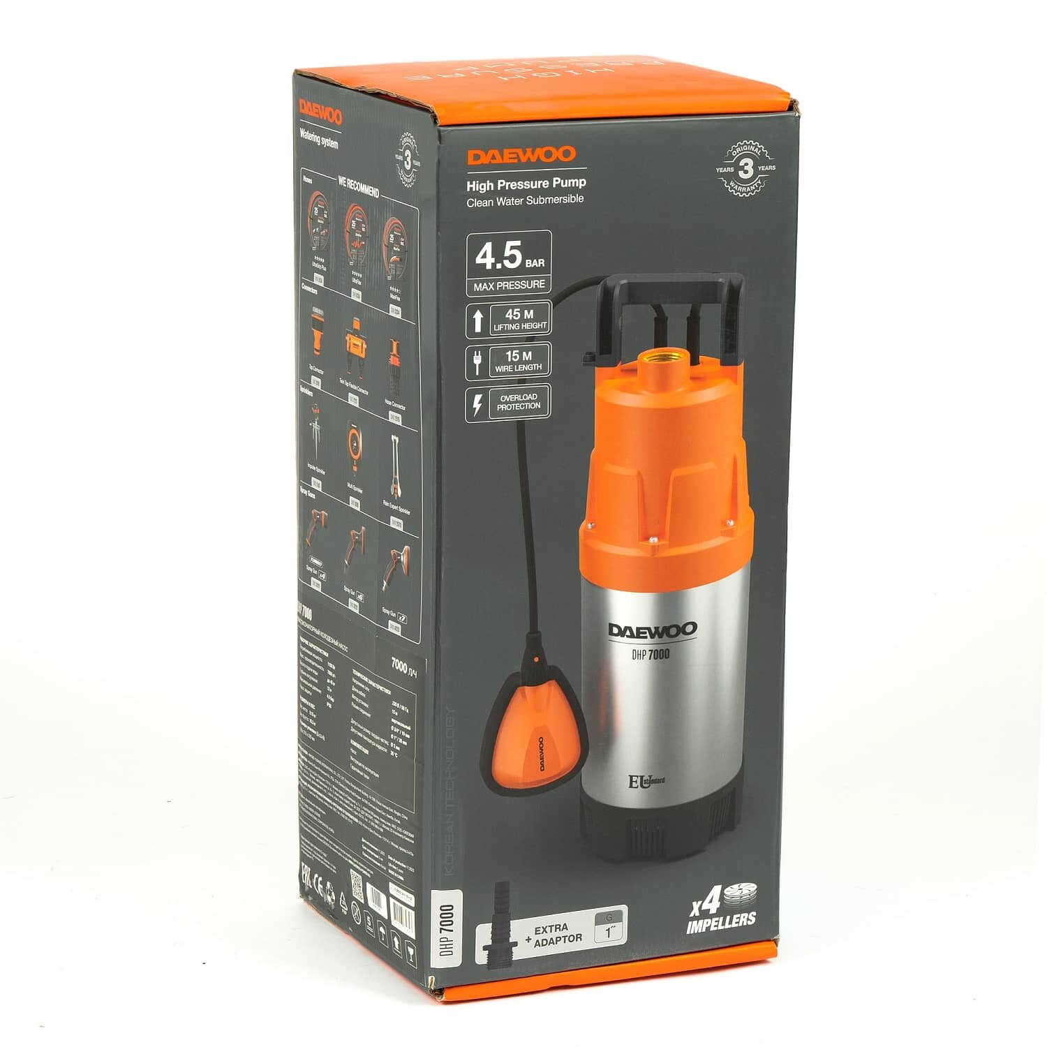 Высоконапорный колодезный насос Daewoo DHP 7000 - это погружной насос мощностью 1100 Вт, с высотой подъёма воды 45 метров и производительностью 116,66 литров в минуту. Он предназначен для использования в колодцах и имеет глубину погружения до 12 метров.Преимущества: Двигатель насоса обладаем мощностью 1100 Вт, что позволяет создавать давление до 4,5, достаточное для подключения нескольких дождевателей. Отлично подойдет для организации полива из колодца или скважины Поплавковый выключатель обеспечивает работу в автоматическом режиме, он отключит мотор при достижении минимального уровня воды и защитит его от «сухого хода» В комплект поставки входит удобный коннектор типа «елочка» для присоединения шланга диаметром 3/4" (19 мм) или 1" (25 мм) Насос оснащен 4 импеллерами, выполненными из высококачественного армированного пластика. Они имеют отличную износостойкость и не подвержены коррозии Корпус насоса выполнен из высококачественного пластика и нержавеющей стали и полностью защищен от попадания влаги внутрь него для полной безопасности и долгого срока службы Популярный диаметр разъема соединения с внутренней резьбой G 1” для легкого подбора соединяющих элементов и фитингов