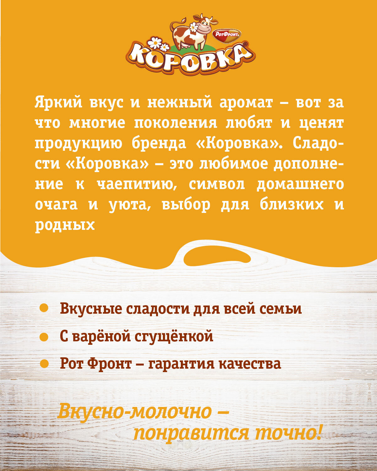 Печенье Коровка с вареной сгущенкой прекрасный спутник любой беседы! Хрустящее сахарное печенье, нежное, рассыпчатое, с насыщенным карамельно-сливочным ароматом вареной сгущенки и тонким в меру сладким вкусом, напоминающим топленое молоко. Румяные квадратики с рельефным изображением добродушной коровки прекрасно сочетаются с чаем, кофе и молоком.