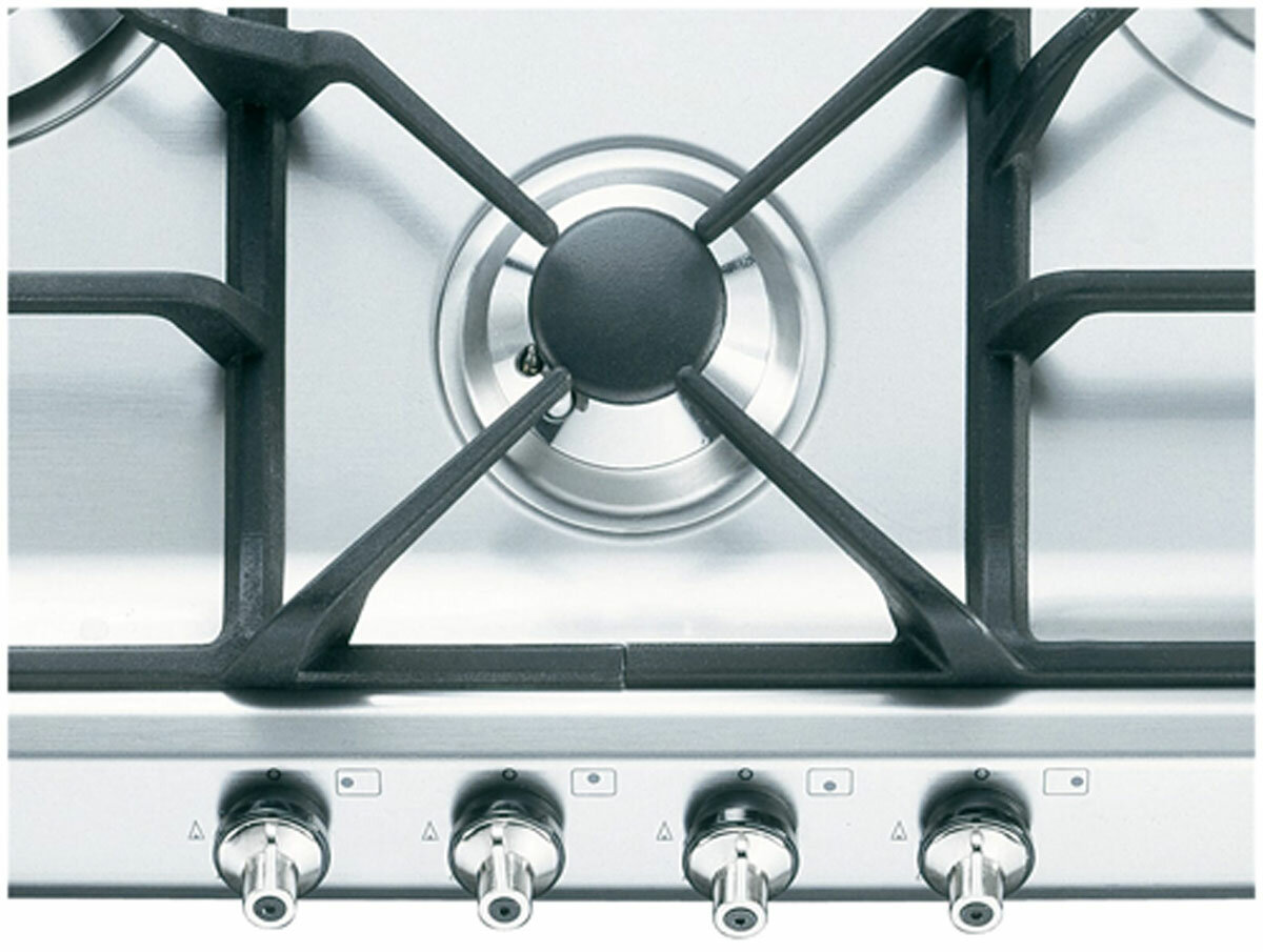 Газовая варочная панель Smeg Ширина 60 см, 4 газовые горелки. Нержавеющая сталь, чугунные решетки, серебристые переключатели. Автоматический электроподжиг. Относится к серии моделей Classica.