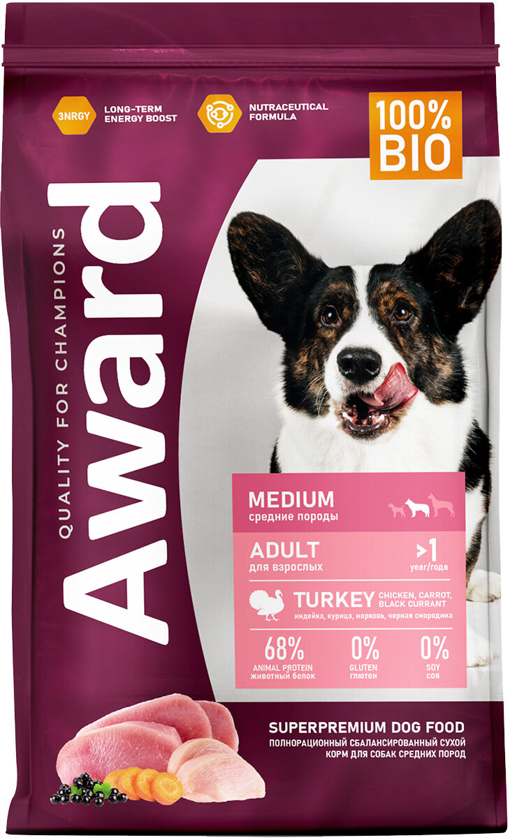 Сухой корм AWARD для взрослых собак средних пород с индейкой и курицей с добавлением моркови и черной смородины 2 кг. Корм изготовлен из 100% натуральных ингредиентов по инновационной формуле — это обеспечивает комплексную нутрицевтическую поддержку организма питомца. При изготовлении корма использовалась технология 3NRGY — сочетание полезных углеводов, дающее длительный запас энергии и чувство сытости. Корм обогащен полиненасыщенными жирными кислотами, которые повышают качество шерсти и укрепляют иммунитет. Пробиотики и пребиотики помогают сохранять естественный баланс кишечной микрофлоры и способствуют оптимальному усвоению питательных веществ. В состав добавлена морковь — отличный источник клетчатки, улучшающий работу ЖКТ. Без красителей и консервантов.