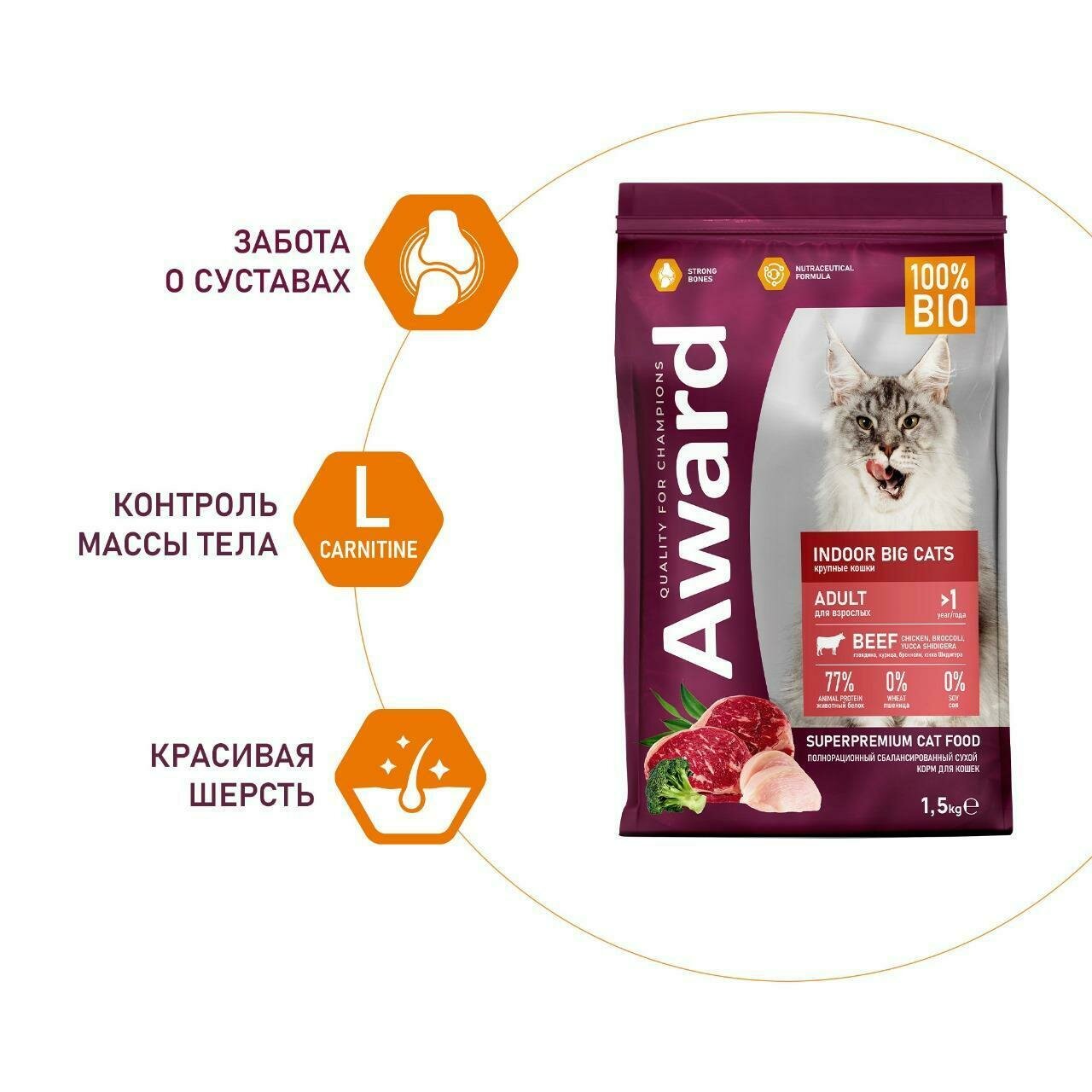 Сухой корм AWARD Indoor Big cats для взрослых домашних кошек крупных пород с говядиной и курицей с добавлением брокколи и юкки Шидигера 400 г Корм изготовлен из 100% натуральных ингредиентов по инновационной формуле — это обеспечивает комплексную нутрицевтическую поддержку организма питомца. Корм обогащен полиненасыщенными жирными кислотами, которые повышают качество шерсти и укрепляют иммунитет. Пробиотики и пребиотики помогают сохранять естественный баланс кишечной микрофлоры и способствуют оптимальному усвоению питательных веществ. Добавление L-карнитина позволяет контролировать массу тела, что особенно важно для кошек крупных пород. Без красителей и консервантов.