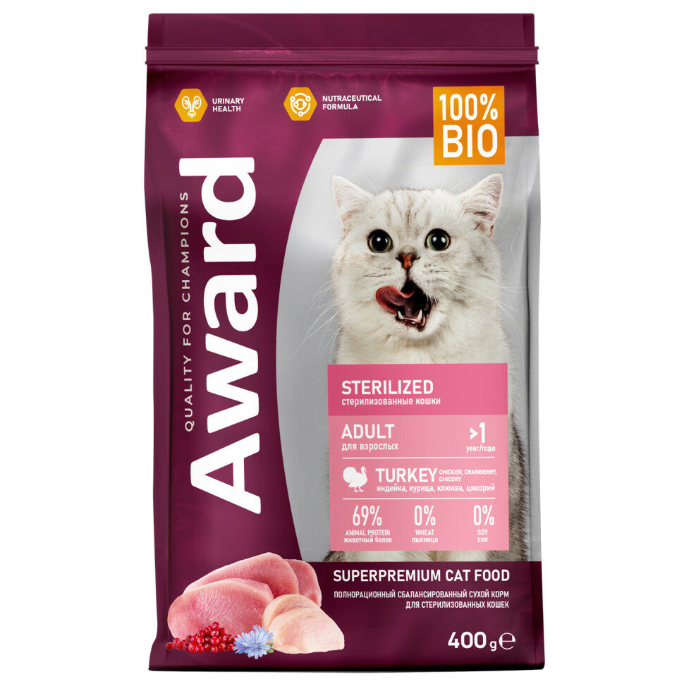 AWARD Sterilized Adult Корм сух.индейкакурицаклюквацикорий д/стерилизованных кошек 400г (7173570)