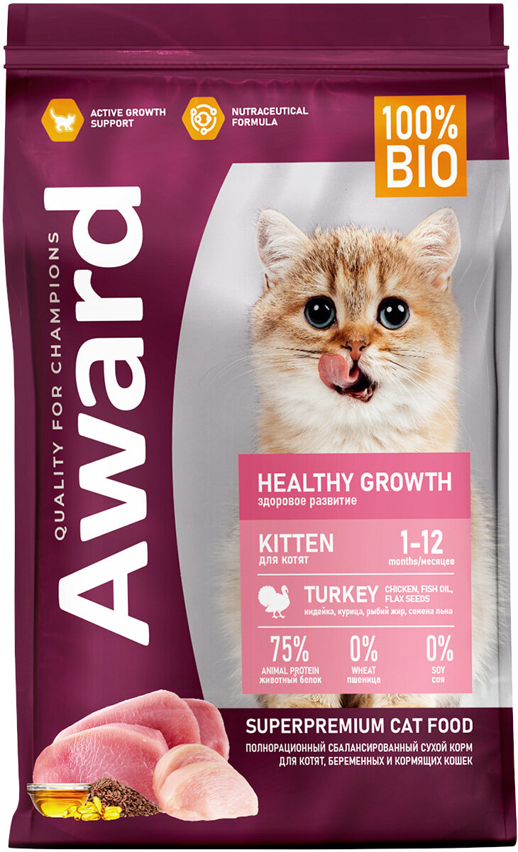 Сухой корм AWARD Healthy growth для котят от 1 месяца, беременных и кормящих кошек с индейкой и курицей с добавлением рыбьего жира и семян льна 400 г.