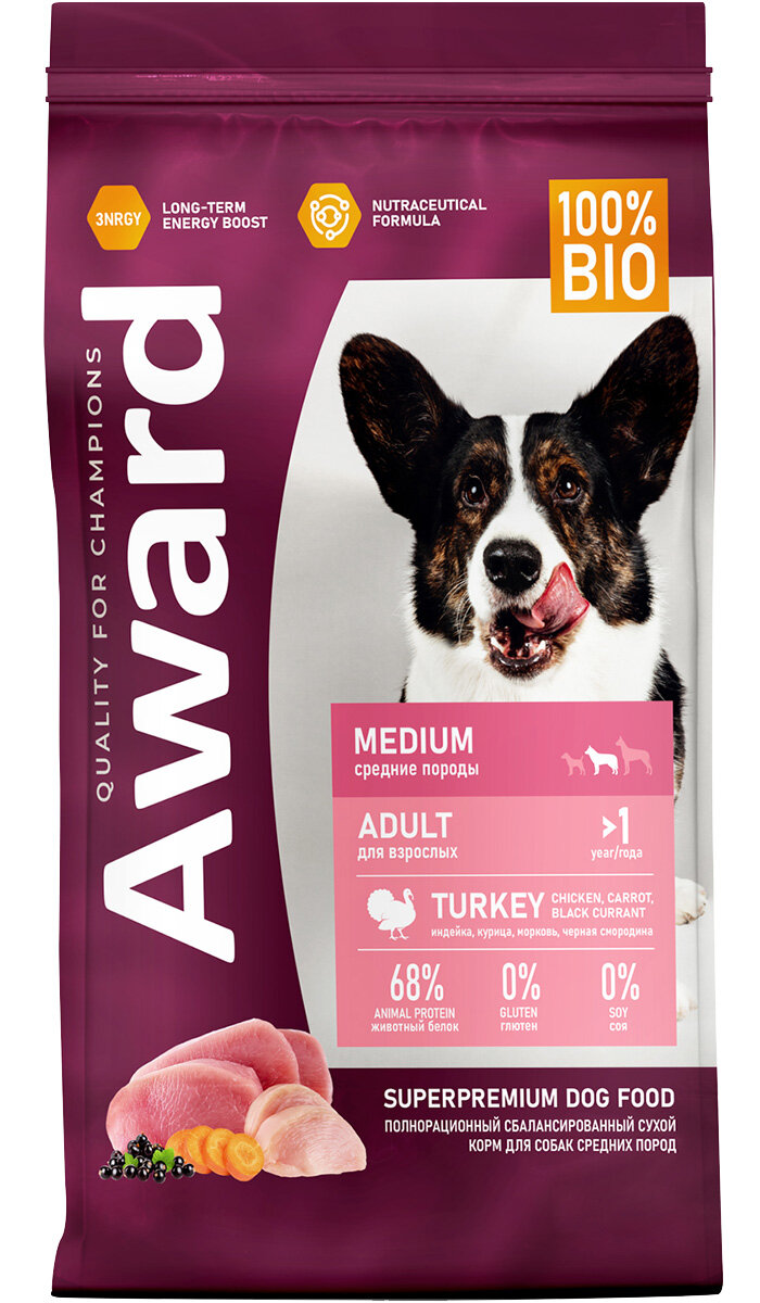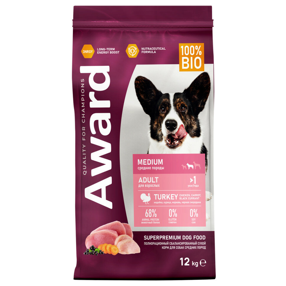 AWARD Adult Medium Корм сух.индейкакурицаморковьчерная смородина д/собак средних пород 12кг (7175772)